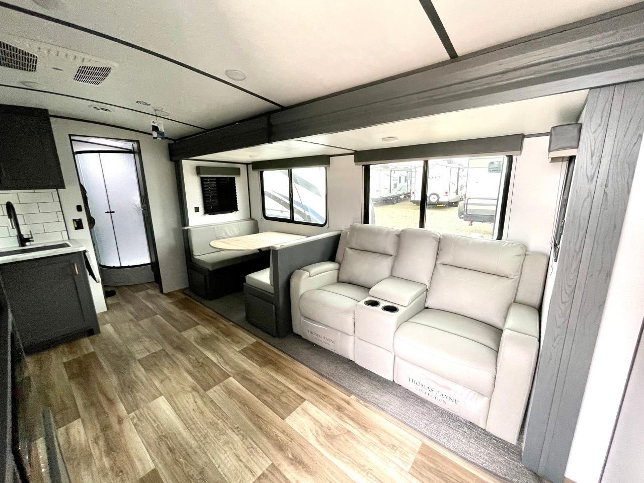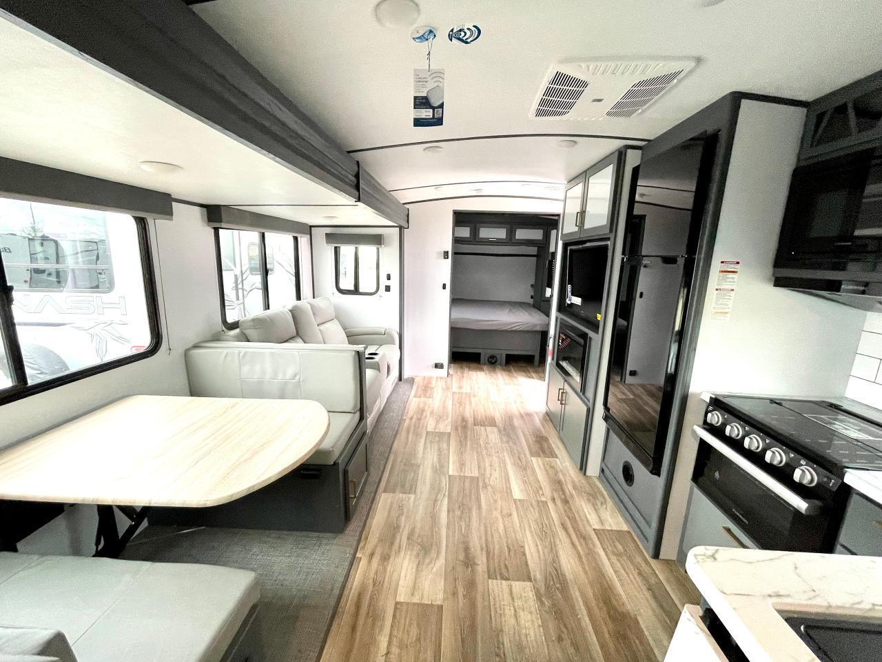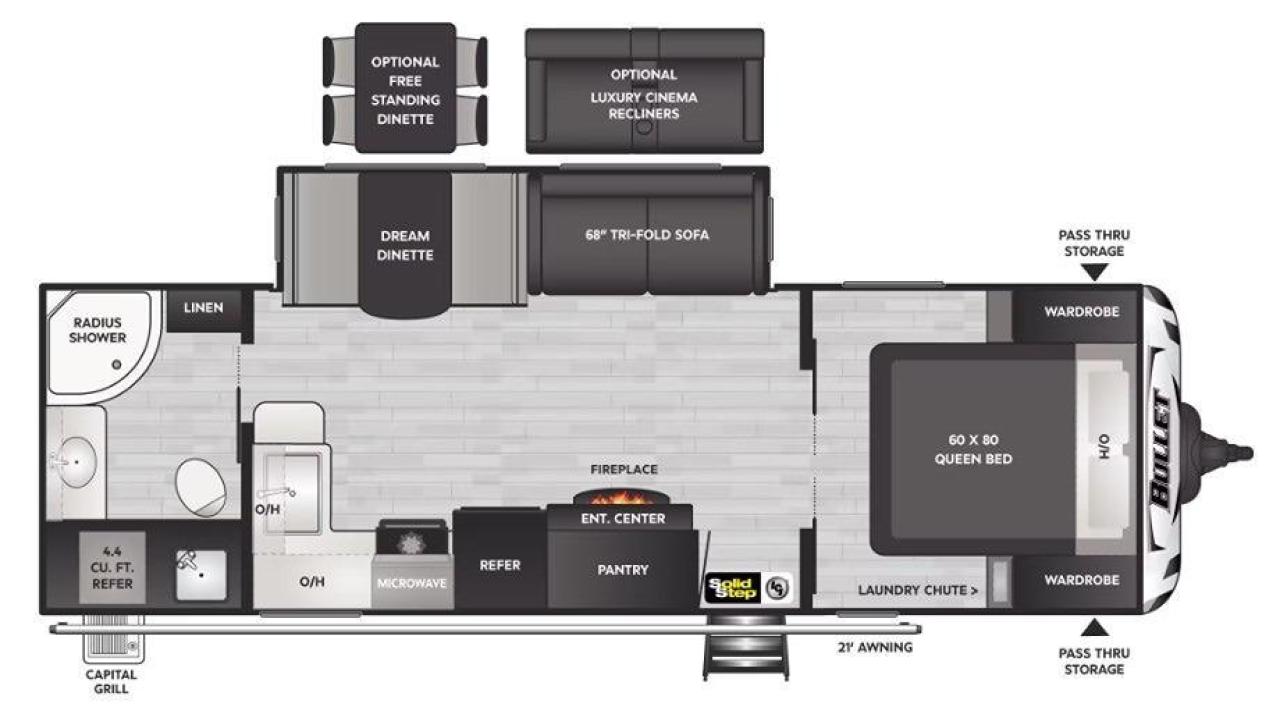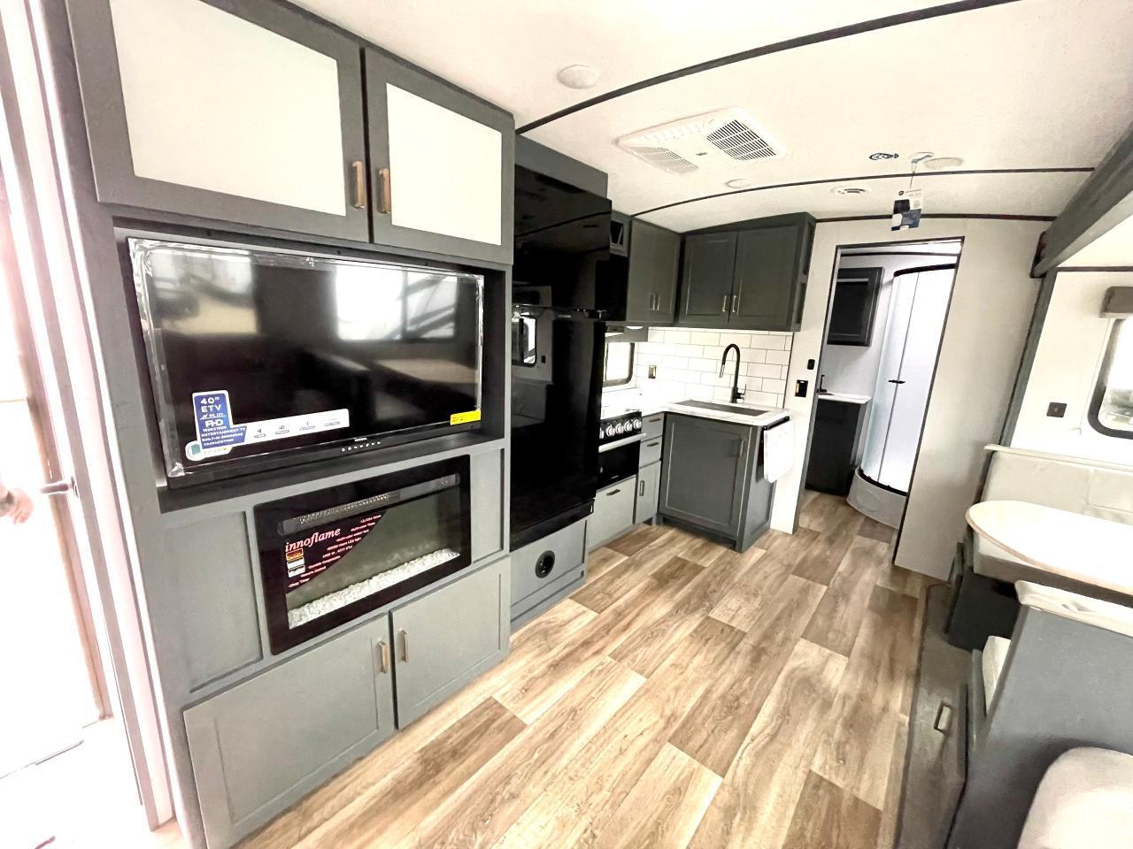 Interior Camping Package: Vaulted Ceilings, LED TV, AM/FM Stereo with Bluetooth, 3 Burner Range w/Cover, Stainless Steel Sink w/High Rise Faucet, Pop Up Outlets in Kitchen, Decorative Backsplash, Dream Dinette, Queen Bed, Laundry Chute