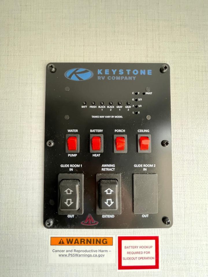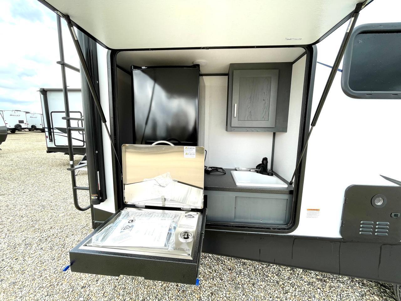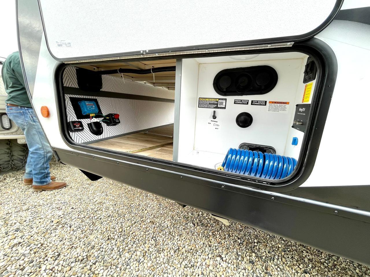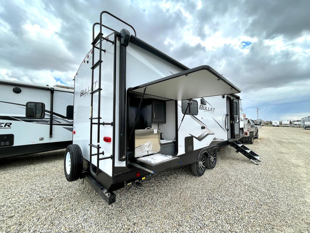 Exterior Camping Package: LCI Solid Steps, XL Grab Handle, Electric Awning w/LED Light Strip, Exterior Speakers, Key TV, Docking Station, 6 gal DSI Gas/Elec Water Heater, Ladder