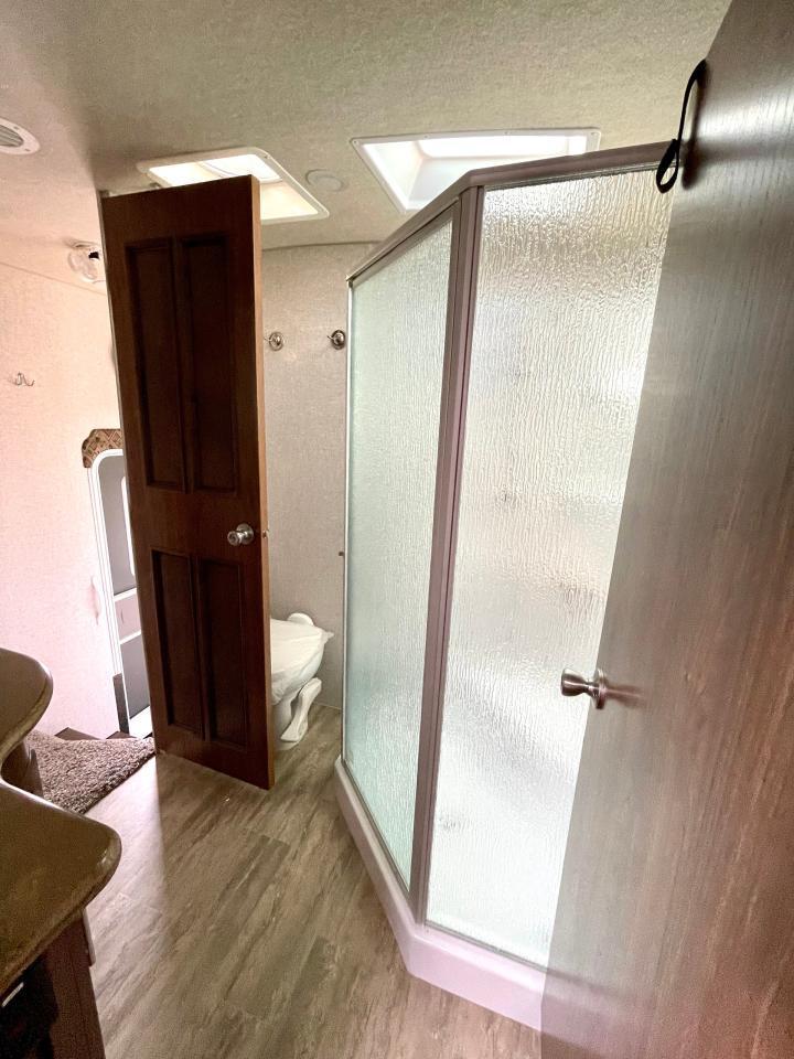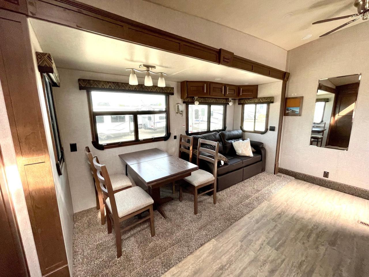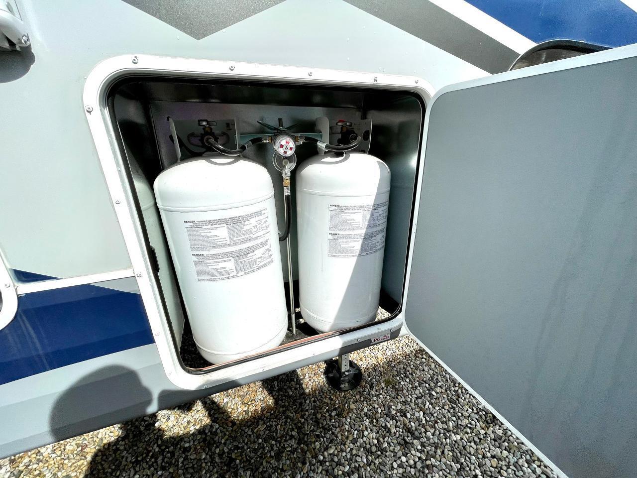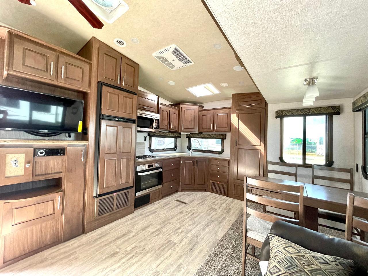 45W Solar Panel, 1.5 CuFt Convection Microwave, 10 Cu Ft LP/AC Refrigerator, Daylighter Kitchen Skylight, Lighted Toe Kick, Arctic Fox Clock and Door Mat, Ceiling Fan, 16 Gal Gas/Electric Water Heater, Coleman AC w/Digital Thermostat, 12V LED Awning, TV Antenna, Solid Surface Countertops, LED Smart TV, Furrion Cooking Suite, Fantastic Fan, Glass Shower Enclosure, TruRest Mattress w/Ultra Deck Sleep System, USB Charge Ports at Dinette and Bed.