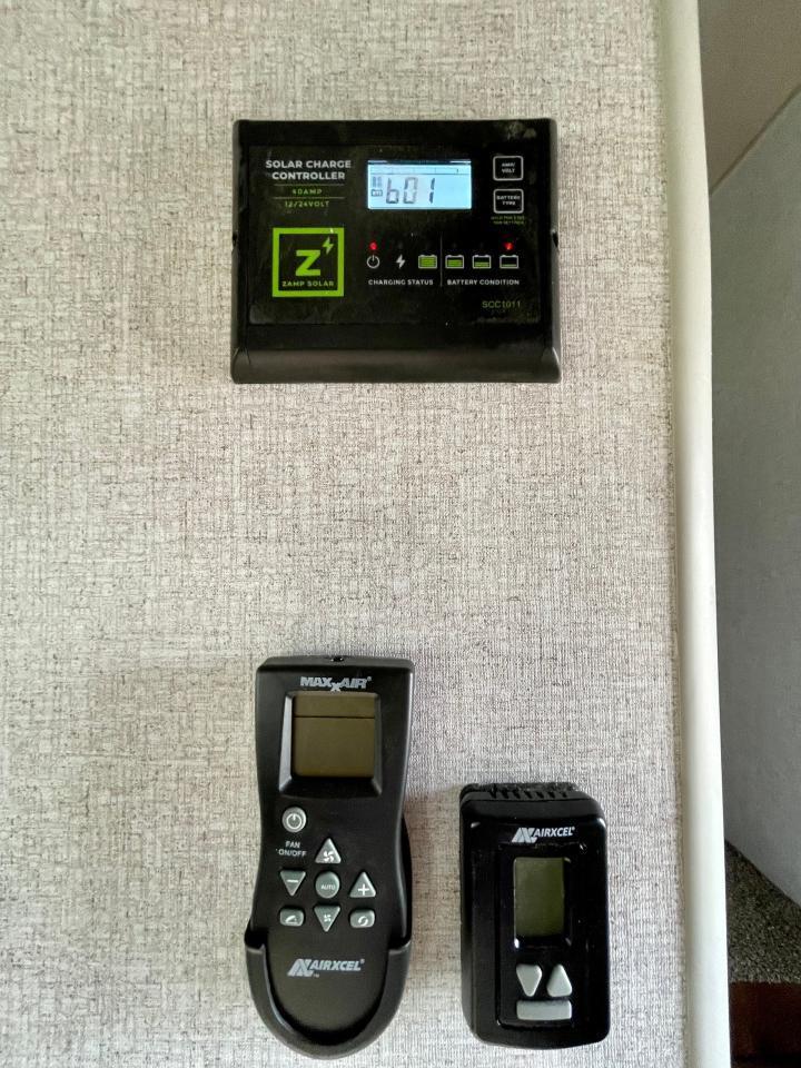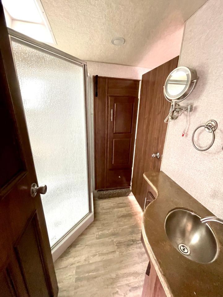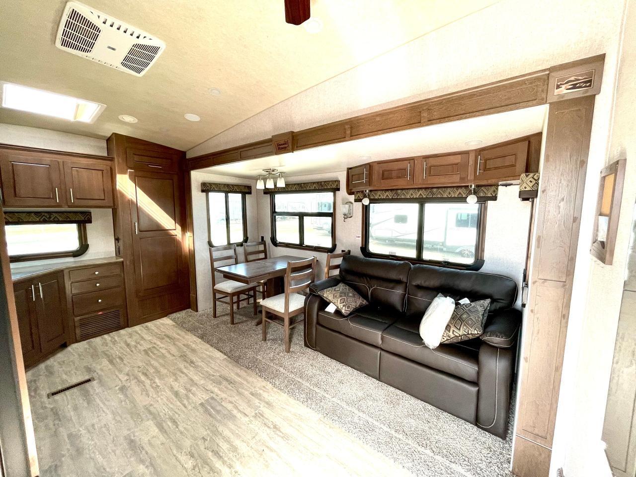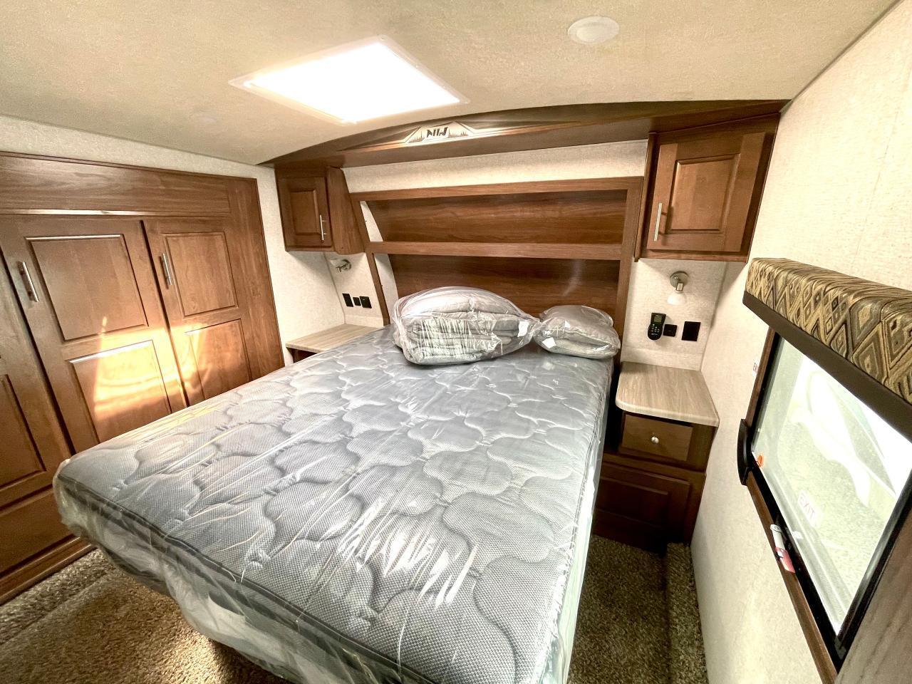 45W Solar Panel, 1.5 CuFt Convection Microwave, 10 Cu Ft LP/AC Refrigerator, Daylighter Kitchen Skylight, Lighted Toe Kick, Arctic Fox Clock and Door Mat, Ceiling Fan, 16 Gal Gas/Electric Water Heater, Coleman AC w/Digital Thermostat, 12V LED Awning, TV Antenna, Solid Surface Countertops, LED Smart TV, Furrion Cooking Suite, Fantastic Fan, Glass Shower Enclosure, TruRest Mattress w/Ultra Deck Sleep System, USB Charge Ports at Dinette and Bed.