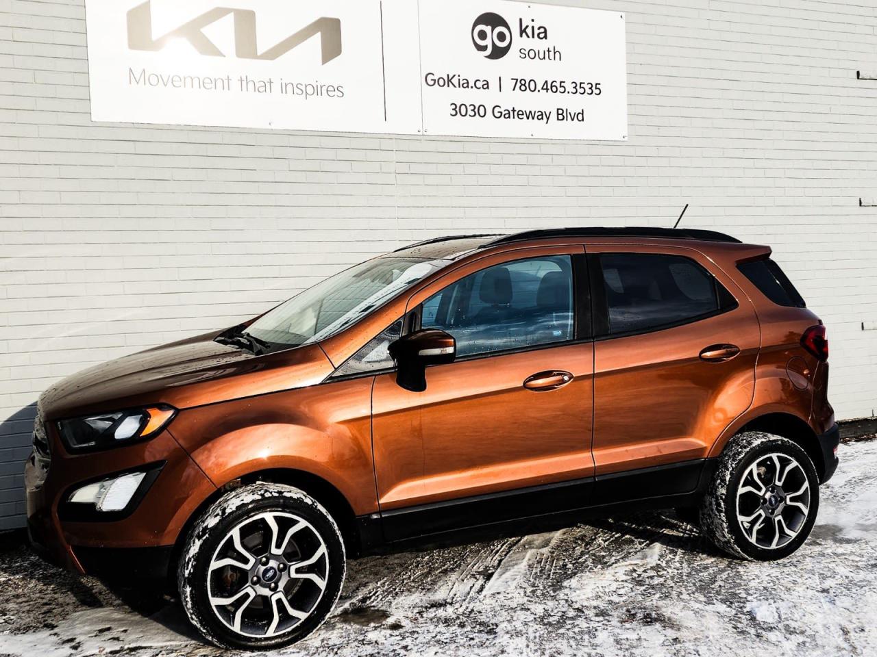 Canyon Ridge Metallic 2018 Ford EcoSport SES 4WD 6-Speed Automatic 2.0L I4 Ti-VCT GDI4-Wheel Disc Brakes, 7 Speakers, ABS brakes, Air Conditioning, Alloy wheels, AM/FM radio: SiriusXM, AppLink/Apple CarPlay and Android Auto, Auto-dimming Rear-View mirror, Automatic temperature control, Axle Ratio: 3.51, Block heater, Brake assist, Bumpers: body-colour, Compass, Delay-off headlights, Driver door bin, Driver vanity mirror, Dual front impact airbags, Dual front side impact airbags, Electronic Stability Control, Emergency communication system: SYNC 3 911 Assist, Exterior Parking Camera Rear, Front anti-roll bar, Front Bucket Seats, Front fog lights, Front reading lights, Front wheel independent suspension, Fully automatic headlights, Heated front seats, Illuminated entry, Knee airbag, Leather Shift Knob, Low tire pressure warning, Navigation System, Occupant sensing airbag, Outside temperature display, Overhead airbag, Overhead console, Panic alarm, Partial Leather-Trimmed Heated Bucket Seats, Passenger door bin, Passenger vanity mirror, Power door mirrors, Power driver seat, Power moonroof, Power steering, Power windows, Radio data system, Radio: AM/FM/MP3 Stereo, Rain sensing wipers, Rear anti-roll bar, Rear Parking Sensors, Rear side impact airbag, Rear window defroster, Rear window wiper, Remote keyless entry, Roof rack, SiriusXM Radio, Speed control, Speed-sensing steering, Split folding rear seat, Spoiler, Steering wheel mounted audio controls, SYNC 3 Communications & Entertainment System, SYNC Connect, Tachometer, Telescoping steering wheel, Tilt steering wheel, Traction control, Trip computer, Turn signal indicator mirrors, Variably intermittent wipers, Wheels: 17" Premium Tarnished Dark.IN HOUSE FINANCING, IN HOUSE LEASING AVAILABLE O.A.C.If you are interested and need more information call or message our sales team, we will be glad to help you now!!Our knowledgeable sales staff will help assist you with every step. To book a test drive or receive further information give us a call at (780)-465-3535 or email us: kiahmed@gokia.caAt Go Kia, were happy to help! Proudly serving Edmonton and all of Alberta including St. Albert, Wetaskiwin, Fort McMurray, Grande Prairie, Drayton Valley, Nisku, Leduc, Rimby, Hinton, St. Paul, Lloydminster, Edson, and all of Western Canada!An AMVIC Licensed Business. Value Priced vehicles are aggressively priced and may require some additional mechanical or cosmetic repairs, all disclosed on a Vehicle Assessment Report!This vehicle may be leased or financed by anyone*, however, due to the recent increase in fraudulent vehicle purchase activity, Go Kia reserves the right to decline a transaction on suspicion of non-retail intentions including but not limited to wholesaling or exporting.*on approved credit, see dealer for details