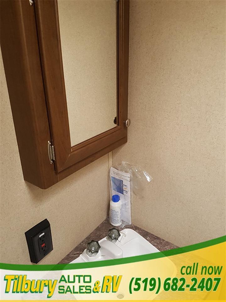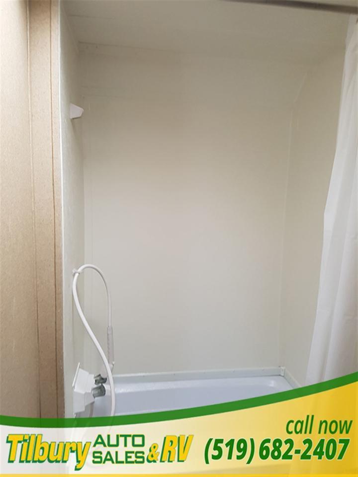 17 ft awning, power outlets, rock-guard, dual propane tanks. Inside you have a kitchen along the bedroom wall. opening up a mid living space. A dinette booth sits across from the sofa that folds into a bed. There is also a space to mount a TV. Towards the rear you will find double bunks and a rear bath with a shower / tub.