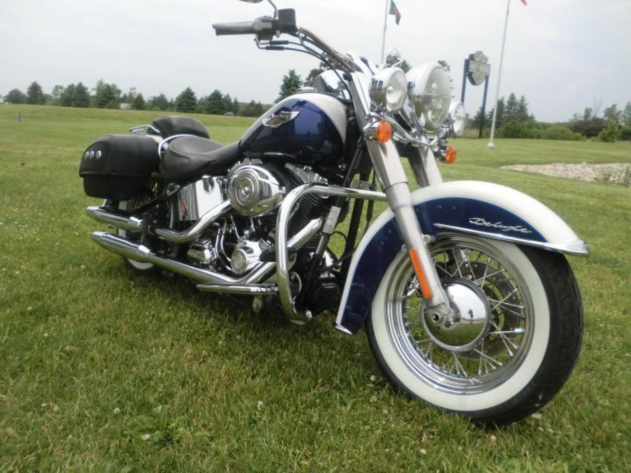 Beautiful Softail Deluxe in White Gold Pearl and Cobalt Blue ! Detachable Deluxe windshied, Deluxe lockable saddlle bags, passenger pillion,luggage rack. 96 cubic inch and six speed !! H-D LOW INTEREST RATES ..!! OUR PRICES FOLLOW THE OMVIC REGULATIONS OF FULL DISCLOSURE IN PRICING NO HIDDEN COSTS OR FEES PRICE SHOWN INCLUDES THE BASIC BIKE PRICE AND OPTIONS, TIRE FEE,OMVIC FEE,ADMINISTRATION FEE.. Prices ARE SUBJECT TO HST !!