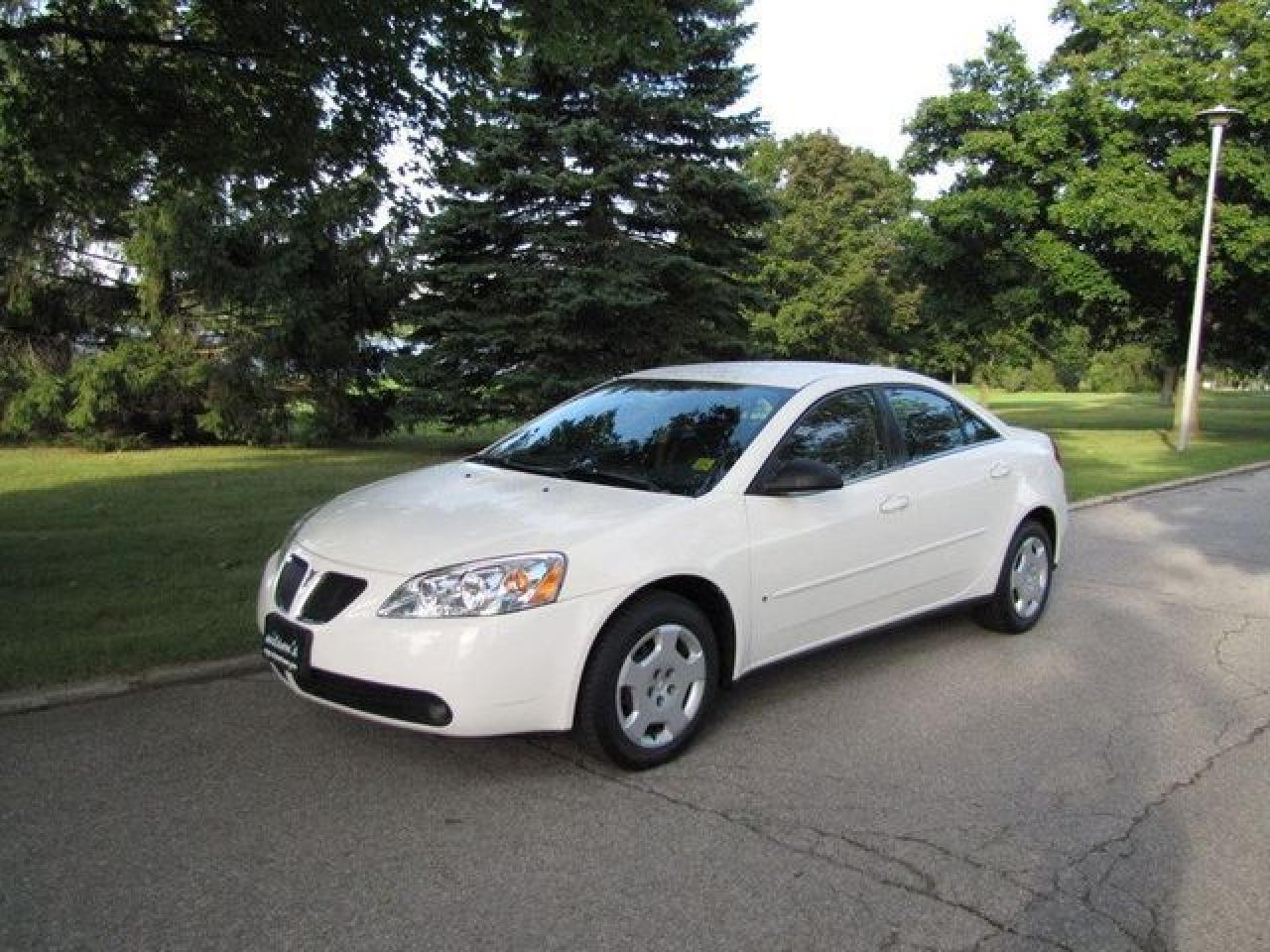 This 2006 Pontiac G6 4dr NEW TIRES!! GM LEASE RETURN!! Sedan features a 2.4L L4 MPI DOHC 4 cyl Gasoline engine. It is equipped with a 4 Speed Automatic transmission. The vehicle is White with a CHARCOAL Cloth interior. It is offered with the remaining factory warranty. Over 400 BETTER used cars in stock!! PLEASE CALL 1-866-348-8146 5.99% Financing + no payments up to 6 months available on approved credit!! Free Trial Exchange!! A+ Better Business Bureau rating!! Voted Guelph's Favourite dealer 2004-2009!! Since 1961. Taxes, licensing, and $5.00 OMVIC fee are extra. Call for details on our Free Trial Exchange! Thank you for considering Wilsons!!! Please call 1-866-348-8146. - This Pontiac is in Excellent overall exterior condition, Excellent overall interior condition, Cloth seats - Air Conditioning, Cruise Control, Power Steering, Power Windows, Power Door Locks, Power Mirrors, Clock, Tachometer, Digital Info Center, Tilt Steering Wheel, Driver Airbag, Passenger Airbag, Keyless Entry, ABS Brakes, Rear Defogger, Intermittent Wipers, AM-FM, CD Player, Alloy Wheels, Cloth Interior Surface - Contact The Internet Department at 866-738-6045 or leads@markwilsonsbetterusedcarstc.dealer.com for more information. -