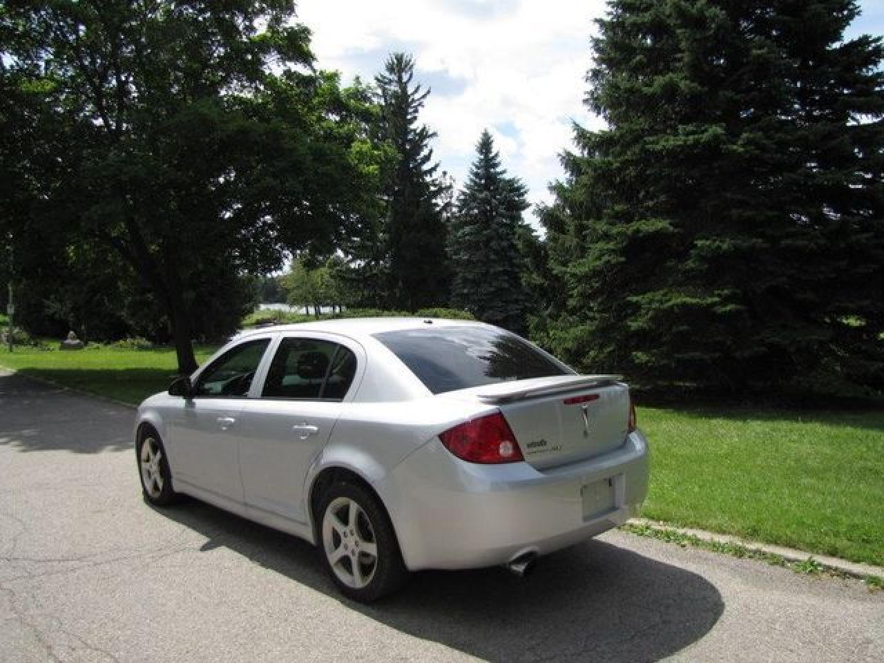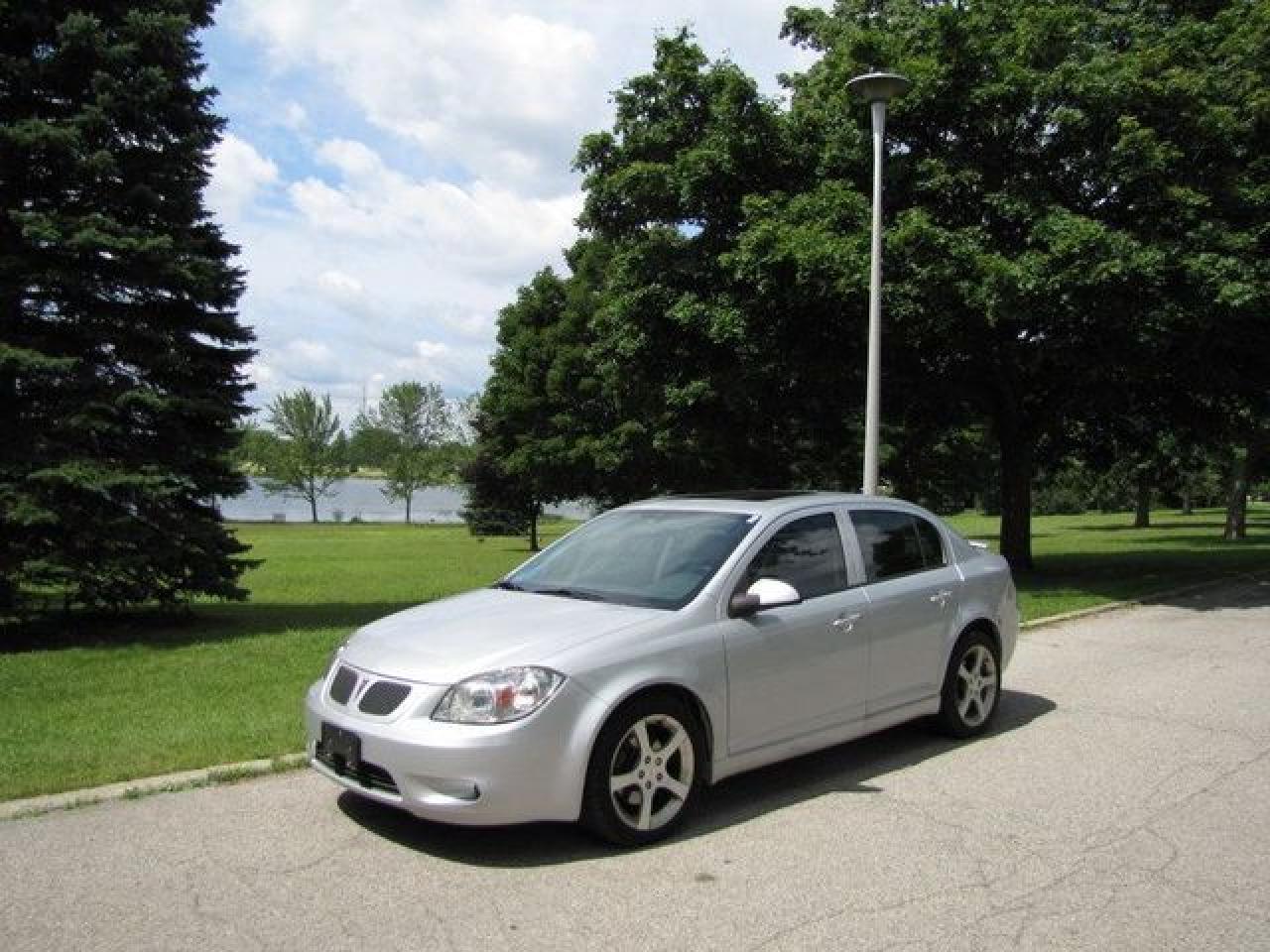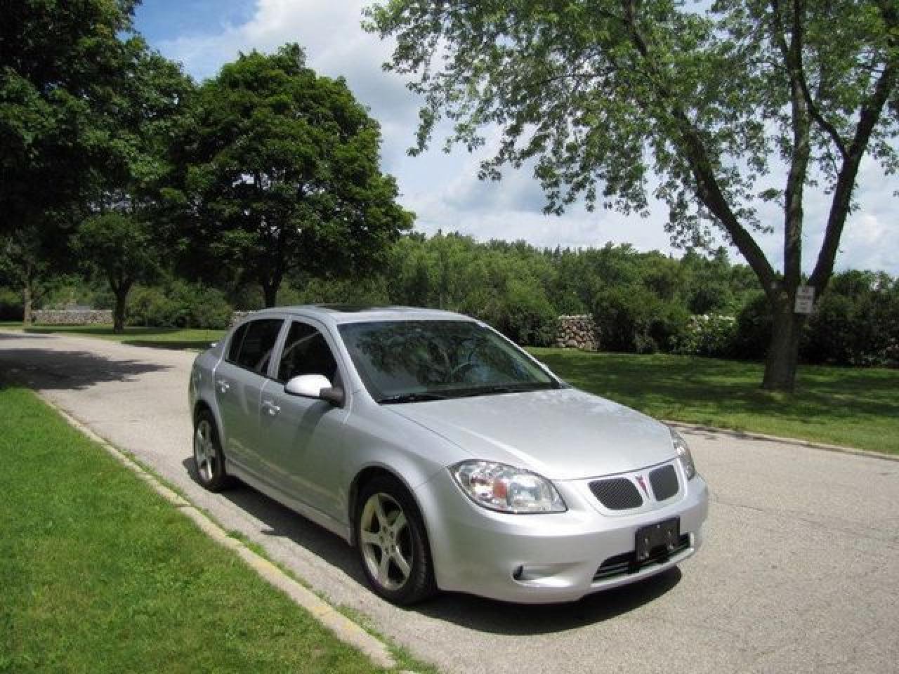 This 2007 Pontiac G5 4dr GT LEATHER!! SUNROOF!! SPOILER! ALLOYS! Sedan features a 2.4L L4 SFI 4 cyl Gasoline engine. It is equipped with a Automatic transmission. The vehicle is Silver with a Grey Leather interior. It is offered with the remaining factory warranty. Over 400 BETTER used cars in stock!! PLEASE CALL 1-866-348-8146 5.99% Financing + no payments up to 6 months available on approved credit!! Free Trial Exchange!! A+ Better Business Bureau rating!! Voted Guelph's Favourite dealer 2004-2009!! Since 1961. Taxes, licensing, and $5.00 OMVIC fee are extra. Call for details on our Free Trial Exchange! Thank you for considering Wilsons!!! Please call 1-866-348-8146. - This Pontiac is in Excellent overall exterior condition, Excellent overall interior condition, Leather seats - Air Conditioning, Cruise Control, Power Steering, Power Windows, Power Door Locks, Power Mirrors, Leather Steering Wheel, Heated Seat, Clock, Digital Info Center, Tilt Steering Wheel, Steering Wheel Radio Controls, Sunroof, Driver Airbag, Passenger Airbag, Keyless Entry, ABS Brakes, Rear Defogger, Intermittent Wipers, AM-FM, CD Player, Alloy Wheels, Leather Interior Surface - Contact The Internet Department at 866-738-6045 or leads@markwilsonsbetterusedcarstc.dealer.com for more information. -