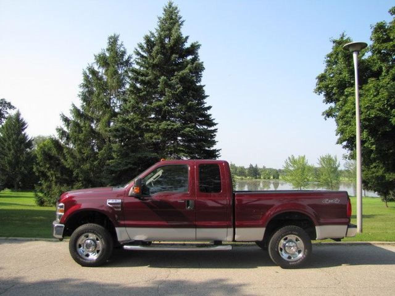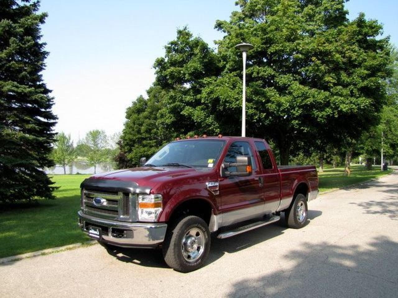 This 2008 Ford Super Duty F-250 XLT DIESEL !!! NEW TIRES!! FORD LEASE RETURN!! 4x4 Truck features a 6.4L V8 FI 8 cyl Diesel engine. It is equipped with a Automatic transmission. The vehicle is DARK TOREADOR RED with a BEIGE Cloth interior. It is offered with the remaining factory warranty. Over 400 BETTER used cars in stock!! PLEASE CALL 1-866-348-8146 5.99% Financing + no payments up to 6 months available on approved credit!! Free Trial Exchange!! A+ Better Business Bureau rating!! Voted Guelph's Favourite dealer 2004-2009!! Since 1961. Taxes, licensing, and $5.00 OMVIC fee are extra. Call for details on our Free Trial Exchange! Thank you for considering Wilsons!!! Please call 1-866-348-8146. - This Ford is in Excellent overall exterior condition, Excellent overall interior condition, Cloth seats - Air Conditioning, Cruise Control, Power Steering, Power Windows, Power Door Locks, Power Mirrors, Leather Steering Wheel, Power Drivers Seat, Tow Package, Clock, Tilt Steering Wheel, Driver Airbag, Passenger Airbag, Keyless Entry, ABS Brakes, Rear Defogger, Intermittent Wipers, AM-FM, CD Player, Chrome Wheels, Cloth Interior Surface, Four Wheel Drive - Contact The Internet Department at 866-738-6045 or leads@markwilsonsbetterusedcarstc.dealer.com for more information. -