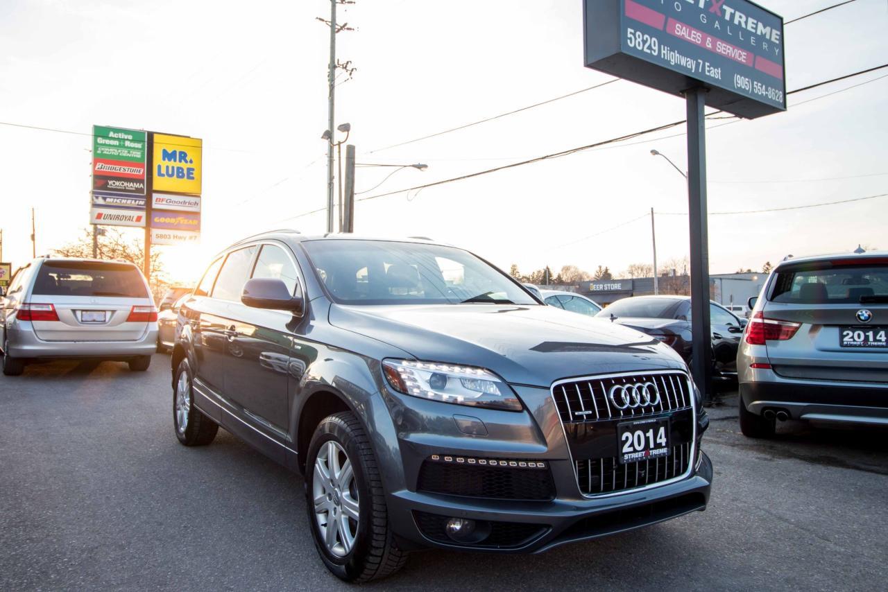 The 2014 Audi Q7 is the flagship luxury SUV in the four-ring brand’s lineup, and the model serves well in that capacity. The large, seven-seat crossover comes with a SUPER CHARGED 3.0 litre V6 engine that produces 333HP and 325 lb-ft of torque!! Inside, the Q7 gets a luxurious cabin with standard leather upholstery, 12-way power adjustable heated front seats, dual-zone climate control, 40/20/40 split folding and sliding rear seats, Bluetooth hands-free capability, and an 11-speaker sound system. Heated rear seats, a panoramic sunroof, and Audi MMI navigation system with Audi Connect infotainment.