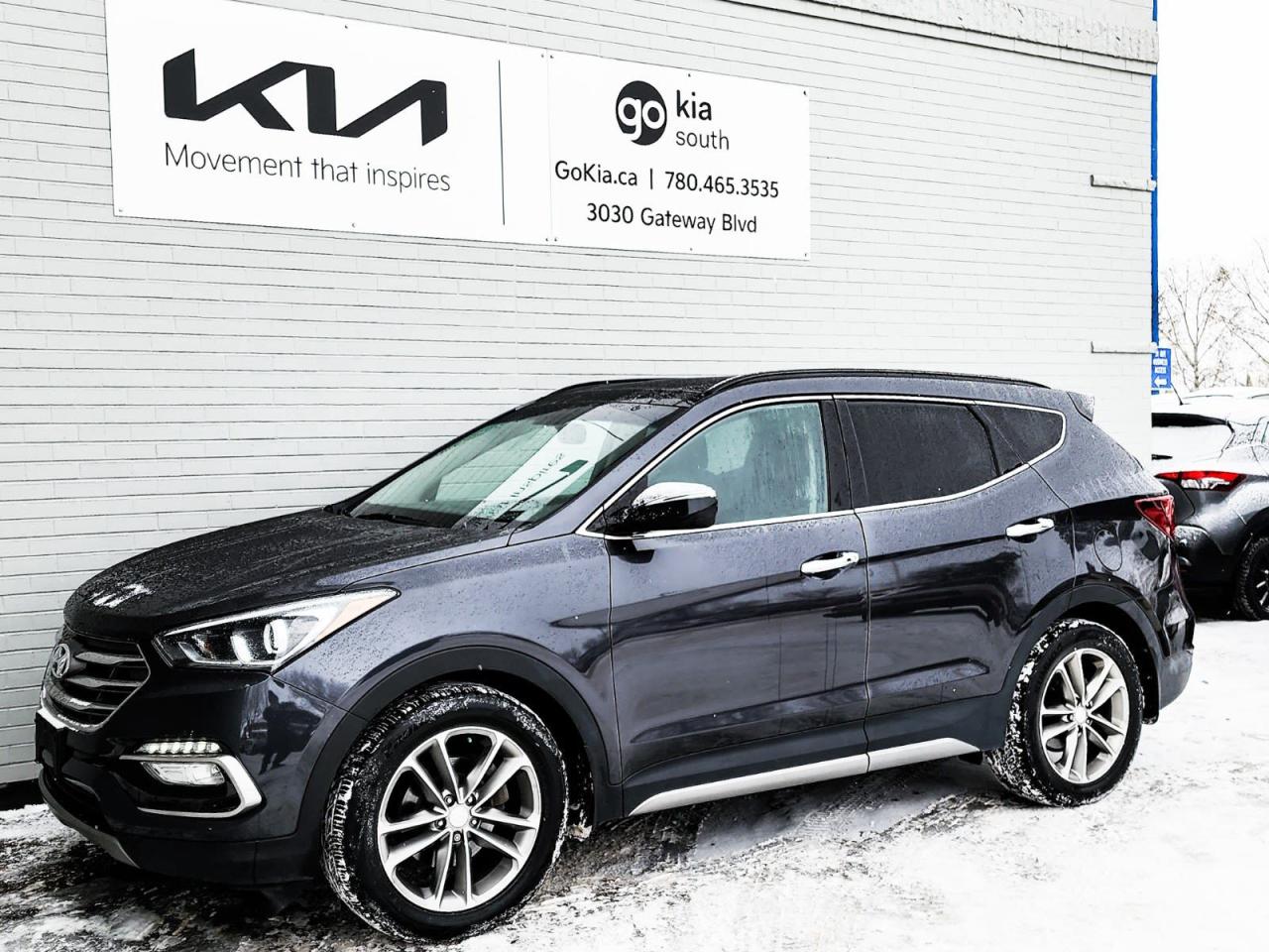 Recent Arrival! Odometer is 65889 kilometers below market average! Platinum Graphite 2017 Hyundai Santa Fe Sport 2.0T AWD 6-Speed Automatic with Shiftronic 2.0L I4 DGI DOHC 16V Turbocharged4-Wheel Disc Brakes, ABS brakes, Air Conditioning, Alloy wheels, AM/FM radio: SiriusXM, Automatic temperature control, Brake assist, CD player, Delay-off headlights, Driver door bin, Driver vanity mirror, Dual front impact airbags, Dual front side impact airbags, Electronic Stability Control, Exterior Parking Camera Rear, Four wheel independent suspension, Front anti-roll bar, Front Bucket Seats, Front dual zone A/C, Front fog lights, Front reading lights, Fully automatic headlights, Heated door mirrors, Heated front seats, Illuminated entry, Knee airbag, Occupant sensing airbag, Outside temperature display, Overhead airbag, Overhead console, Panic alarm, Passenger door bin, Passenger vanity mirror, Power door mirrors, Power driver seat, Power steering, Power windows, Rear anti-roll bar, Rear window defroster, Rear window wiper, Remote keyless entry, Roof rack: rails only, Security system, Speed control, Speed-sensing steering, Split folding rear seat, Spoiler, Steering wheel mounted audio controls, Tachometer, Telescoping steering wheel, Tilt steering wheel, Traction control, Trip computer, Turn signal indicator mirrors, Variably intermittent wipers.IN HOUSE FINANCING, IN HOUSE LEASING AVAILABLE O.A.C.If you are interested and need more information call or message our sales team, we will be glad to help you now!!Our knowledgeable sales staff will help assist you with every step. To book a test drive or receive further information give us a call at (780)-465-3535 or email us: kiahmed@gokia.caAt Go Kia, were happy to help! Proudly serving Edmonton and all of Alberta including St. Albert, Wetaskiwin, Fort McMurray, Grande Prairie, Drayton Valley, Nisku, Leduc, Rimby, Hinton, St. Paul, Lloydminster, Edson, and all of Western Canada!An AMVIC Licensed Business. Value Priced vehicles are aggressively priced and may require some additional mechanical or cosmetic repairs, all disclosed on a Vehicle Assessment Report!This vehicle may be leased or financed by anyone*, however, due to the recent increase in fraudulent vehicle purchase activity, Go Kia reserves the right to decline a transaction on suspicion of non-retail intentions including but not limited to wholesaling or exporting.*on approved credit, see dealer for details