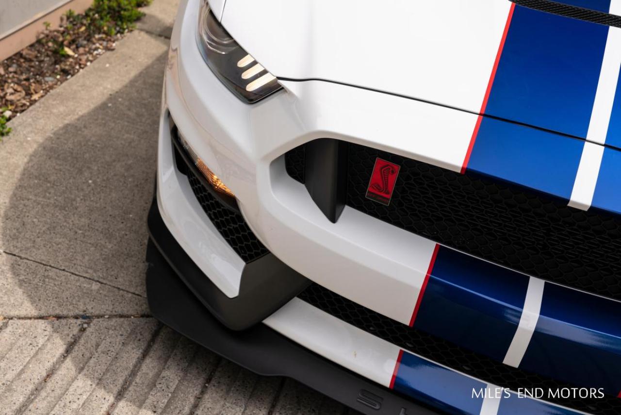 Options: Oxford White SVT Alcantara Recaro Seats Ebony w/ Red Accents Floor Mat Delete Rear Decklid Spolier Wheel Locking Kit 5.2L DOHC TI-VCT V8 6-Speed Manual Transmission F 305/30R19, R 315/30R19 Front License Plate Bracket SYNC Package III Full VEH COV *DLR-INSTLD-ACCY Over the Top Racing Stripes Electronics Package Dual Zone A/C Single CD w/Tuner/Soars Partial Gas Fill Blue w/ Red Stripe