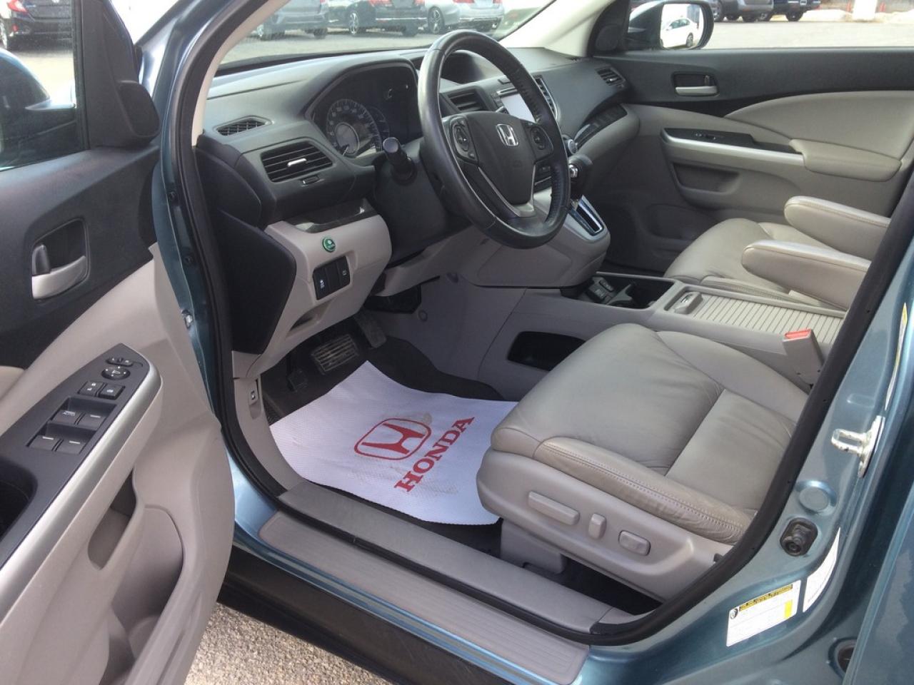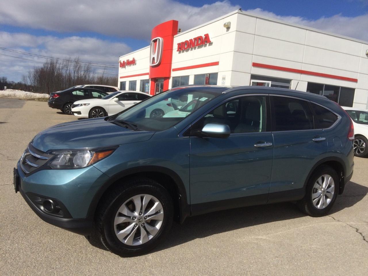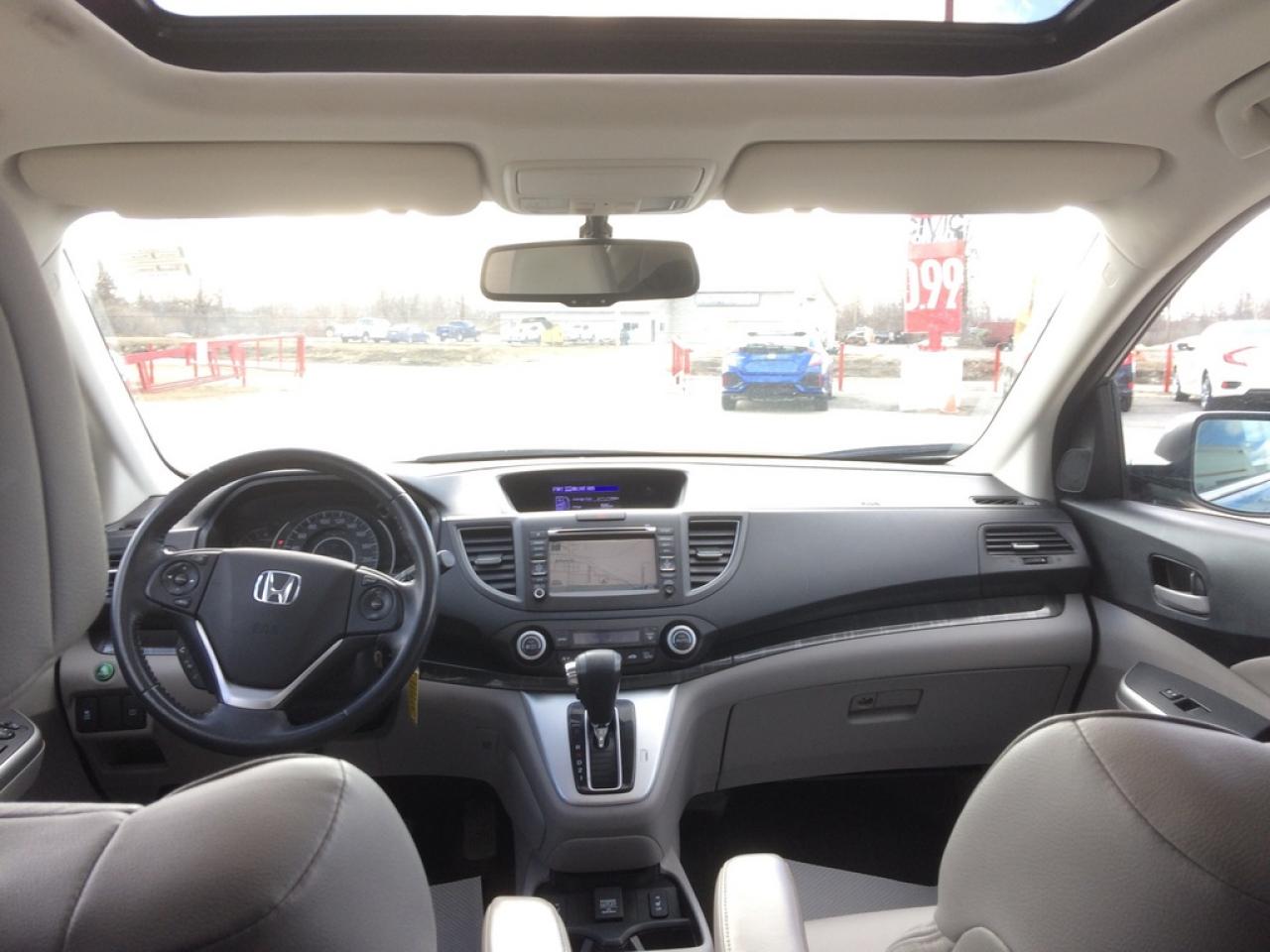 One owner local trade fully loaded CRV Touring. Has been Honda serviced since new and no accident history. It's equipped with every feature available for a 2014 CRV. Leather, heated seats, Navigation, Back-up camera, Bluetooth hands free, One touch fold down rear seats, and much more. Exterior is finished in beautiful Mounain Air Metallic.Â