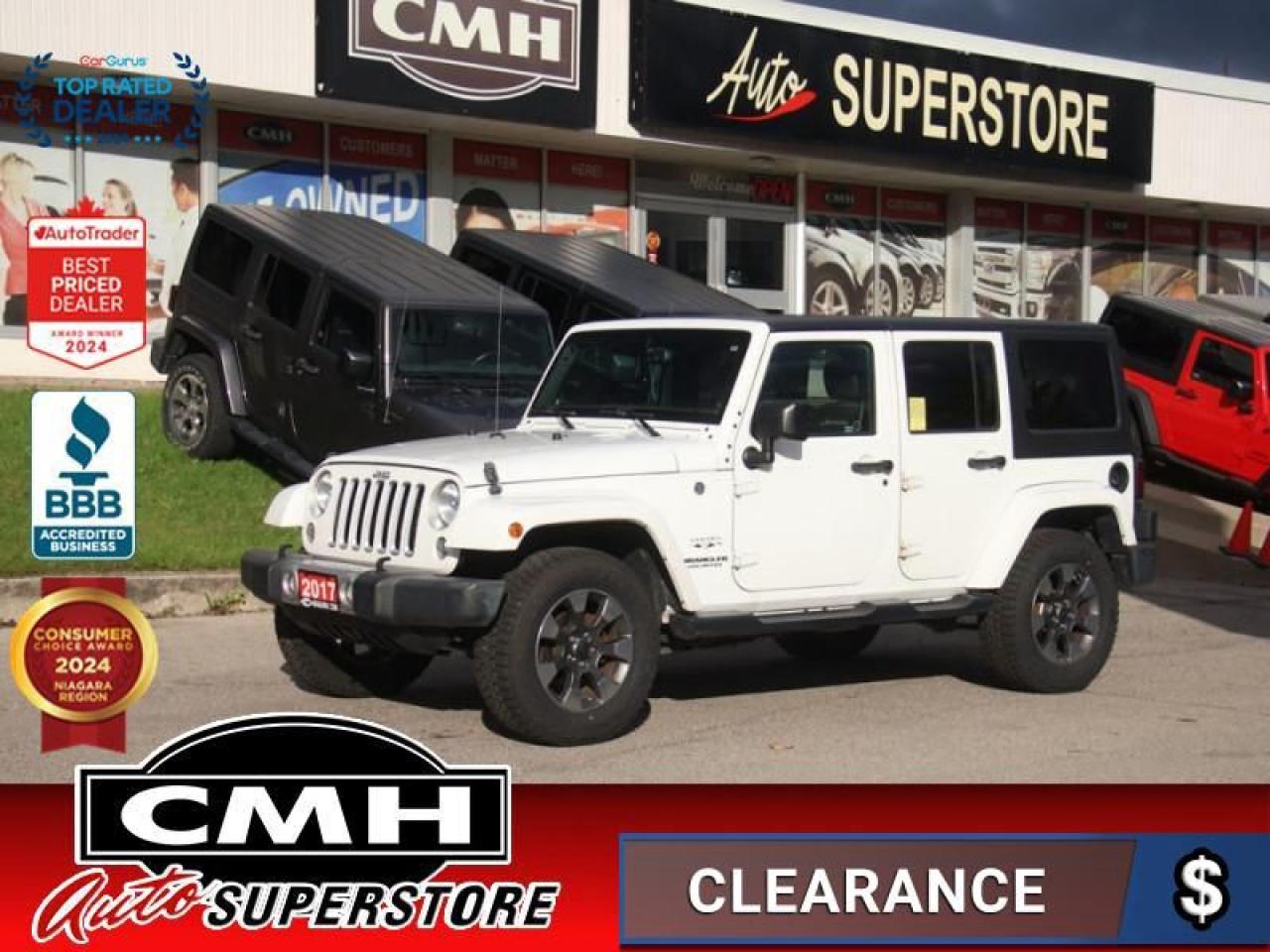 Iconic design has always been part of the Jeep family, and it's never more obvious than with the 2017 Jeep Wrangler Unlimited. This four-door model offers exceptional capability with its Trail Rated status while providing the basic comforts that even hardcore adventurers want. No matter where you want to go, you can rely on this SUV to get you there.This SUV has 187,253 kms. It's white in colour and is major accident free based on the CARFAX Report . It has an automatic transmission and is powered by a 285HP 3.6L V6 Cylinder Engine.