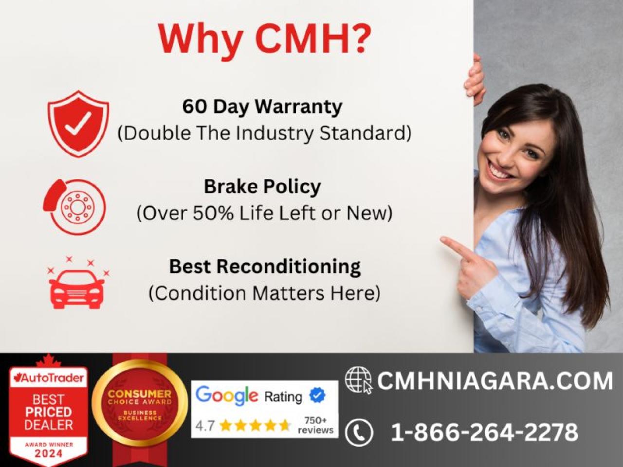 Trade-ins are welcome! Financing available OAC ! Price INCLUDES a valid safety certificate! Price INCLUDES a 60-day limited warranty on all vehicles except classic or vintage cars. CMH is a Full Disclosure dealer with no hidden fees. We are a family-owned and operated business for over 30 years! o~o