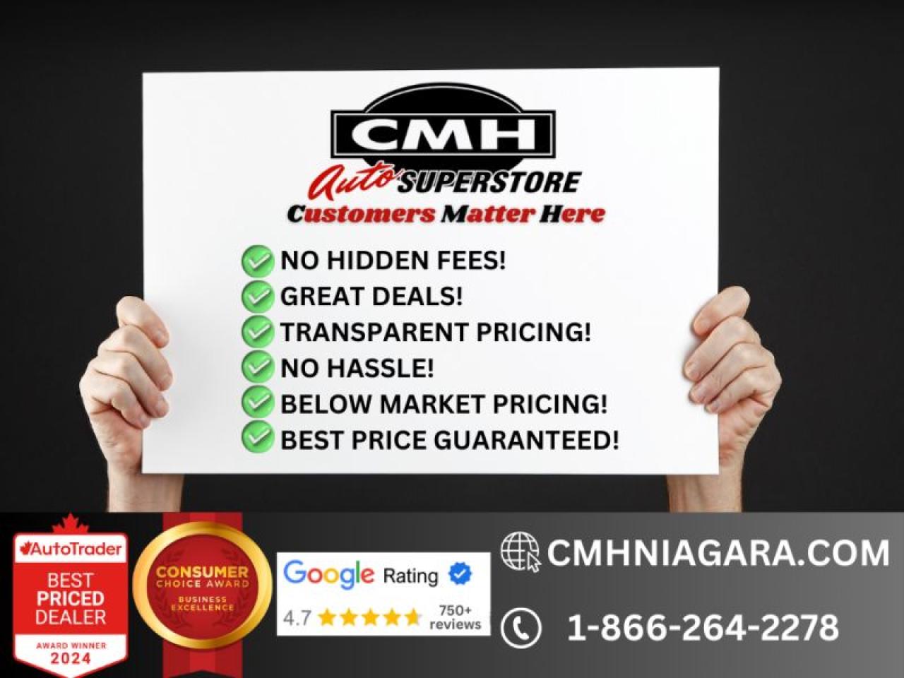 Trade-ins are welcome! Financing available OAC ! Price INCLUDES a valid safety certificate! Price INCLUDES a 60-day limited warranty on all vehicles except classic or vintage cars. CMH is a Full Disclosure dealer with no hidden fees. We are a family-owned and operated business for over 30 years! o~o