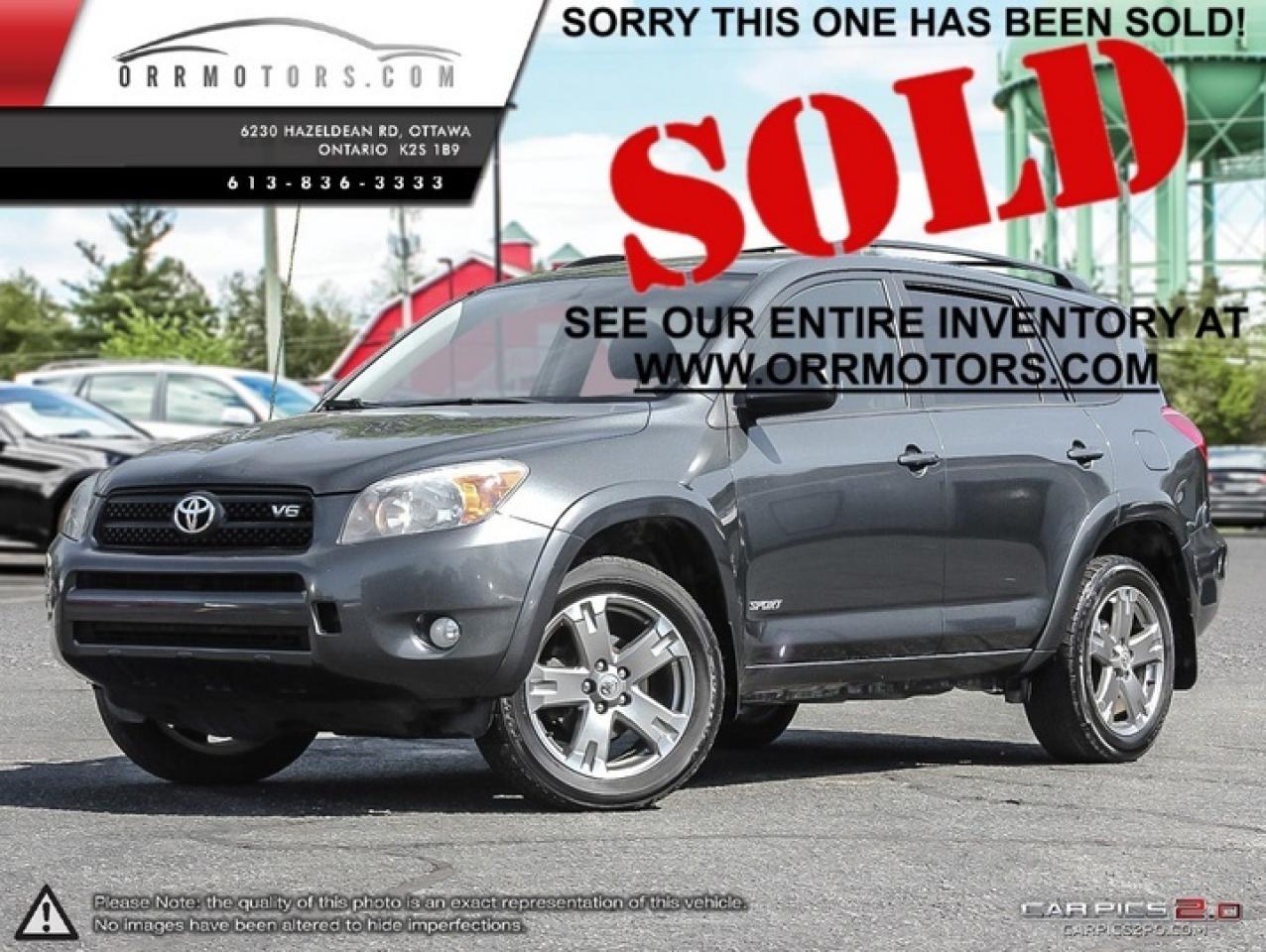 Sport package has everything you want in a RAV4 - nice big alloy wheels, sunroof, awd! The V6 gets almost the same fuel economy as the 4 but you get that extra kick! Come by for a drive, it's a gem! Sold certified etested and satisfaction guaranteed >>>>>>>>>>>>>>>>>>>>>>>>>>>>>>>>>> NO ADMIN FEES. History reports and, more importantly, FULL DISCLOSURE, on all vehicles. WE NEED YOUR TRADE INS! Experts in FINANCING FOR ALL CREDIT. The BEST extended warranties available, safety check in Ontario or Quebec, see our complete inventory at www.orrmotors.com want to know who you are buying from? Google us! Orr motors has been in business for over 50 years and has won the bbbeo torch award for marketplace trust in the automotive category 2010, peoples choice award for best used car dealer 2013, we thrive on happy customers! Licence fees and 13% taxes are not included in our prices - ALL VEHICLES WITH AN "R" IN THE STOCK NUMBER ARE PRIOR DAILY RENTALS - FYI - for every $1000 you borrow at 6% over a 60 month term you will pay about $19.27/month in repayment - this equals a total interest cost of about $158.30 over 5 years for every $1000 you borrow, rates can vary from 4.99% to 29.9% based on your credit, but most commonly are in 5-6% range.