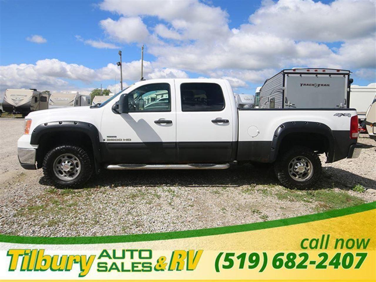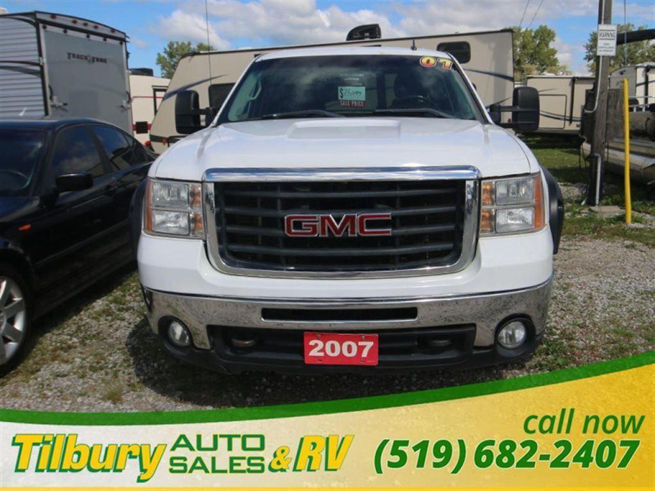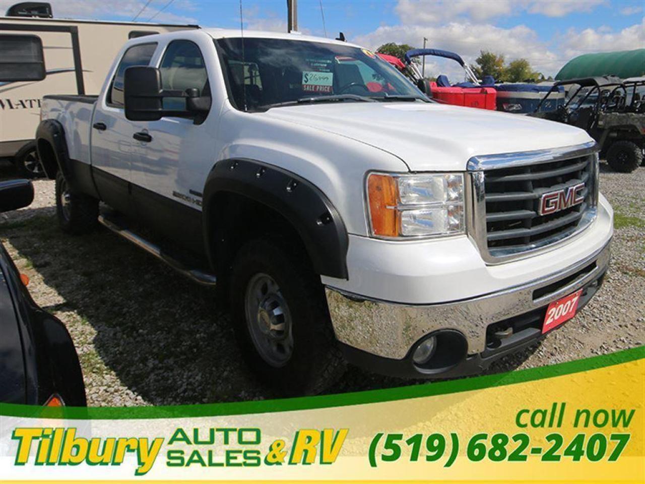 2007 GMC Sierra 2500 Crew Cab HD 4x4 Diesel V-8 6.6L engine with plenty of tow and haul power, four-wheel-drive automatic with traction control ,finished in bright white this one comes very well-equipped including air, cruise, tilt, power windows, power locks, power side extended trailer mirrors with LED signal lights, map pocket doors , delay wipers, power outlet, cup holders. Contact Tilbury Auto Sales at 519-682-2407 or visit our lot today at 20600 HWY #42, TILBURY, ONTARIO. N0P 2L0.