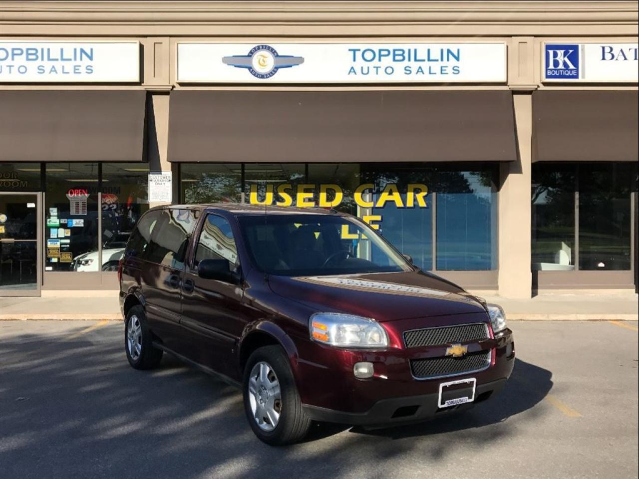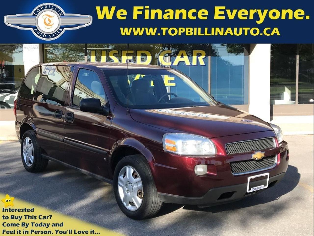 Just Arrived...Local Ontario Chevrolet Uplander, the same body style as the 2008 & 2010 models. This 2009 Chevrolet Uplander comes with Free 2 YEARS Power-train Warranty included in the price and No Extra Cost. Used Car Loan, Financing, Leasing for Company or Personal use is available at the LOWEST possible rate! OAC. **Haggle Free**Hassel Free**fair Pricing** ------------------------------------------------------------------------------------------------------------------ Discover your Exclusive used car loan offer with Easy financing application and a proven way to save money. We offer used car loans for everyone! Good credit car loans, Bad Credit Car loans, No credit car loans, Newcomers to Canada car loans & used car leasing. Used car loan rates start at %4.9, Do Not pay up to 90 days OAC. Apply Today! Secure, No obligation, you will love the results. www.topbillinauto.ca Cost of borrowing $10,000 @ %4.9 over 60M is $1,300 ------------------------------------------------------------------------------------------------------------------ WE FINANCE EVERYONE. 100% APPLICATIONS ACCEPTED. Apply Today, Drive Tomorrow! WE CAN HELP! ------------------------------------------------------------------------------------------------------------------ FREE 2 YEARS WARRANTY INCLUDES UNLIMITED KILOMETERS, $600 PER CLAIM, COVERS (ENGINE, TRANSMISSION, DIFFERENTIAL, HEAD GASKET & ETC.) CANADA WIDE. Warranty Upgrade is Available. AS PER OMVIC REGULATION STANDARDS ' VEHICLE IS NOT DERIVABLE, NOT CERTIFIED AND NOT E-TESTED. CERTIFICATION AND E-TEST AVAILABLE FOR FIVE HUNDREDS AND NINETY FIVE DOLLARS'. THIS VEHICLE WILL BE DRIVABLE AFTER CERTIFICATION IS DONE!!! YOU DON’T HAVE TO PAY FOR SAFETY CERTIFICATE, YOU CAN SAFETY THROUGH YOUR OWN MECHANIC. SOME VEHICLES MAY COME WITH VALID E-TEST!!! TO LEARN MORE ABOUT THIS RULE PLEASE CONTACT DEALER. TOPBILLIN AUTO SALES serving customers from all over Ontario including: GTA, Toronto, Scarborough, Mississauga, Vaughan, Richmond Hill, Markham, Oshawa, Pickering, Ajax, Whitby, Hamilton, Burlington, Brampton, Kitchener, Waterloo, Milton, Oakville, Newmarket, Aurora, Barrie and London. FOR ALL PROMOS AND FINANCING SOME RESTRICTIONS MAY APPLY. Can't you find your desired vehicle in our inventory? NO Problem! We find your ideal vehicle. Call us today! ------------------------------------------------------------------------------------------------------------------ We sell and ship cars across Canada & the USA at the lowest possible cost, delivered to your door. ------------------------------------------------------------------------------------------------------------------ Indoor Showroom Location: 7855 KEELE ST, VAUGHAN, ON, L4K1Y6 (JUST NORTH OF HWY7 ON KEELE ST.) BUSINESS HOURS: Mon-Fri 9:30 AM to 7:30 PM, Saturday 10 AM to 5 PM, Sunday 12 PM to 4 PM