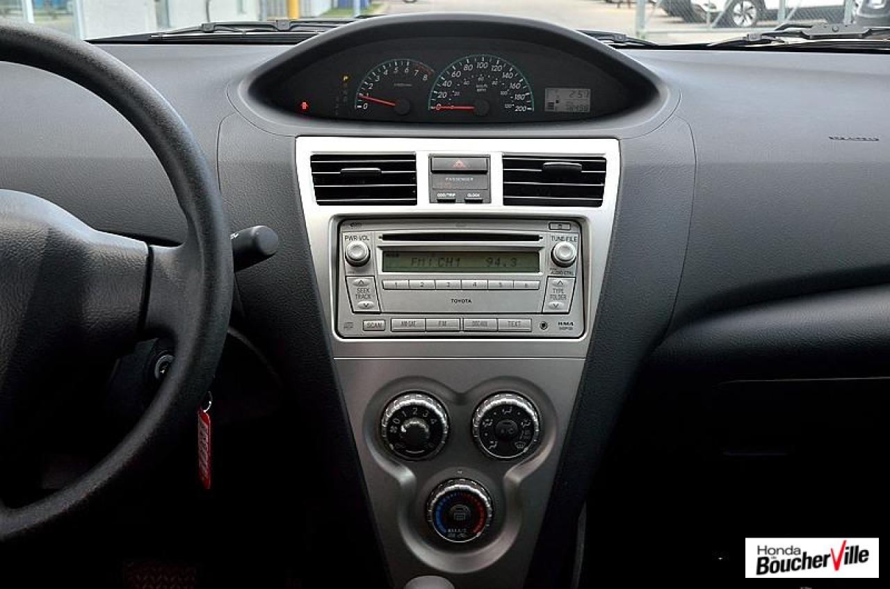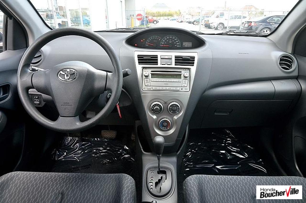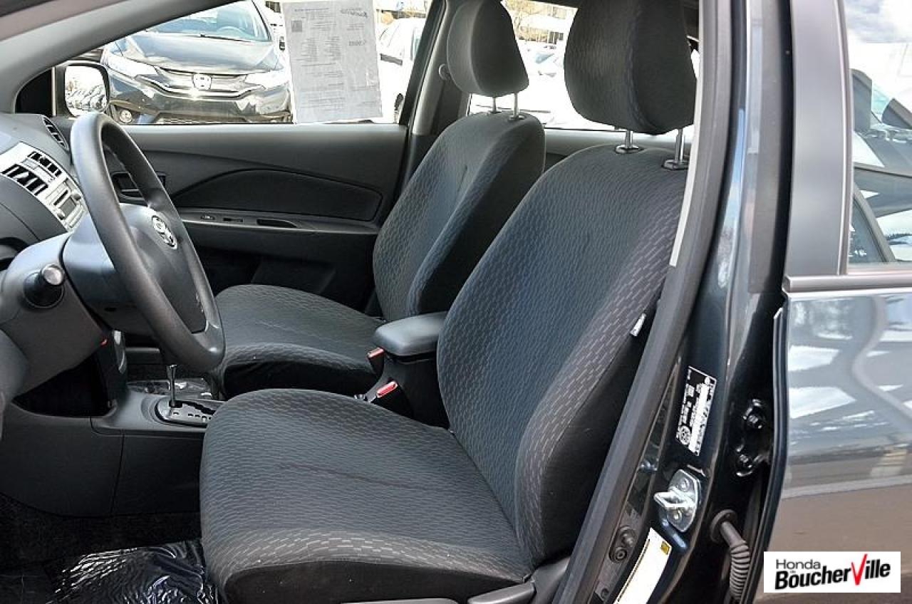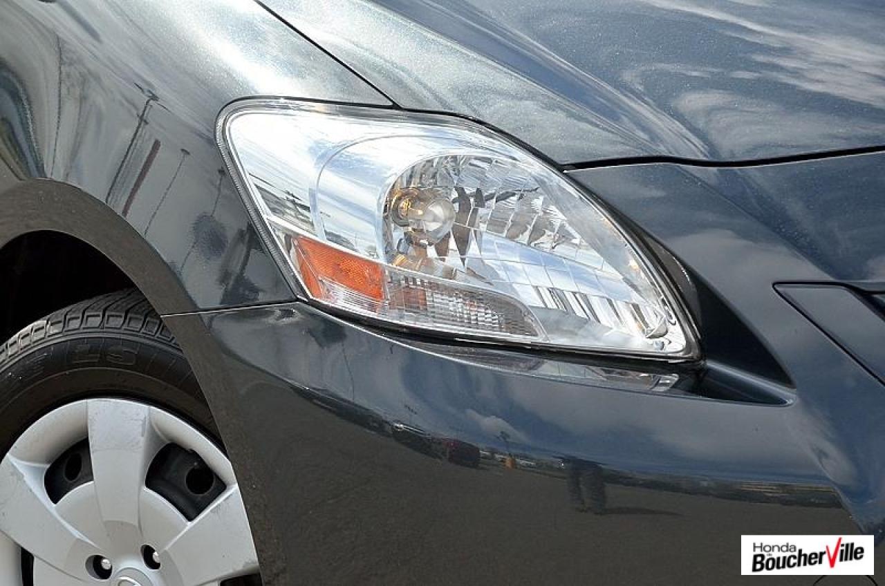 Toyota Yaris Sedan Base 2012\n\nEssuie-glaces intermittents, Anti-démarreur, Freins ABS, Contrôle de stabilité, Coussin gonflable conducteur, Lecteur CD, Lecteur MP3, Portes électriques, Tachymètre, Vitres électriques, Air climatisé, Volant ajustable, Tapis protecteurs, Tout équipé, Radio AM/FM, Direction assistée, Antipatinage, Coussins gonflables, Enjoliveurs de roues, Verrous de sécurité pour enfants, Dégivreur de lunette arrière, Miroirs ajustables de l'intérieur, Sièges baquets, Technologie Bluetooth intégrée\n\n