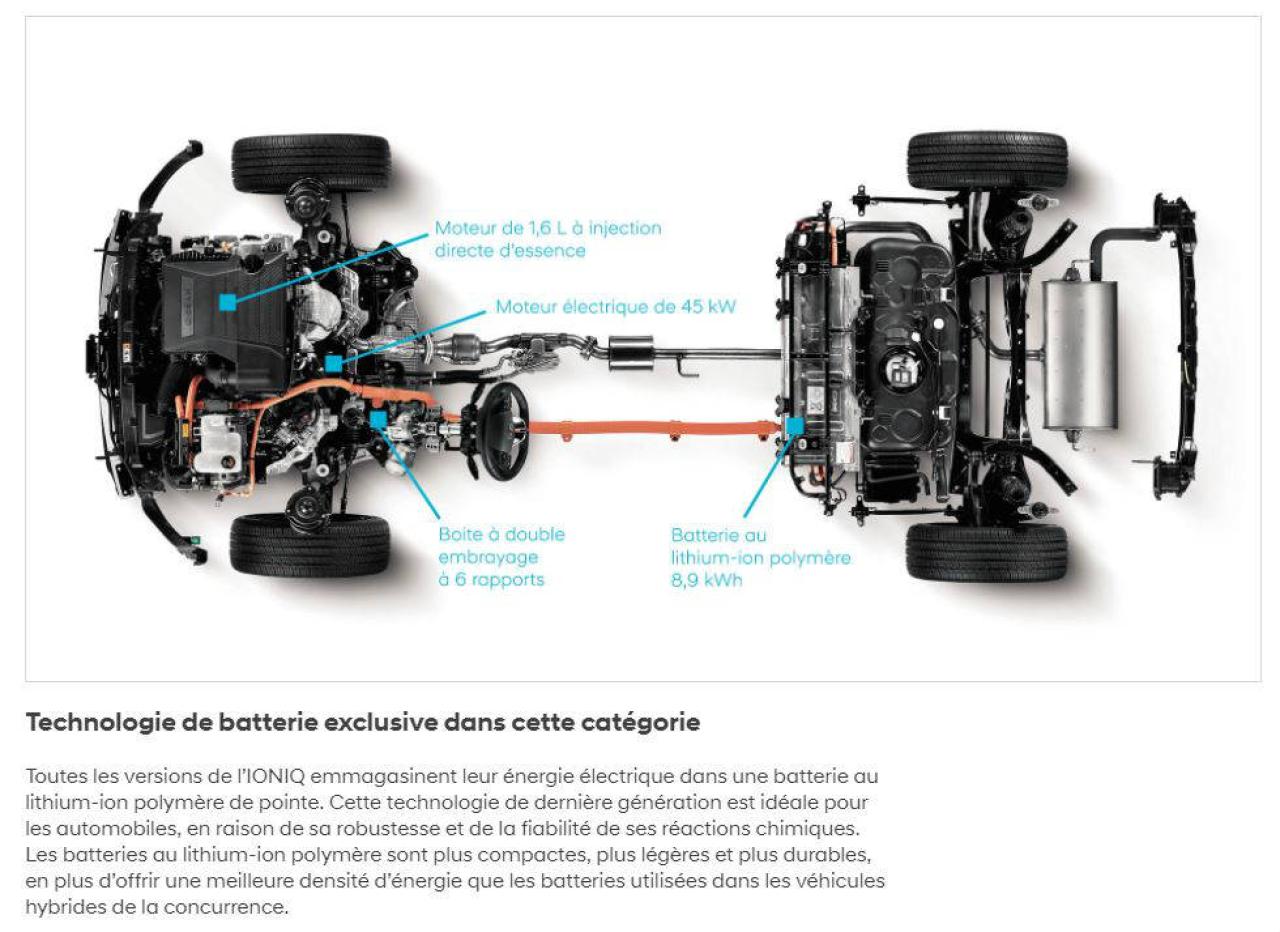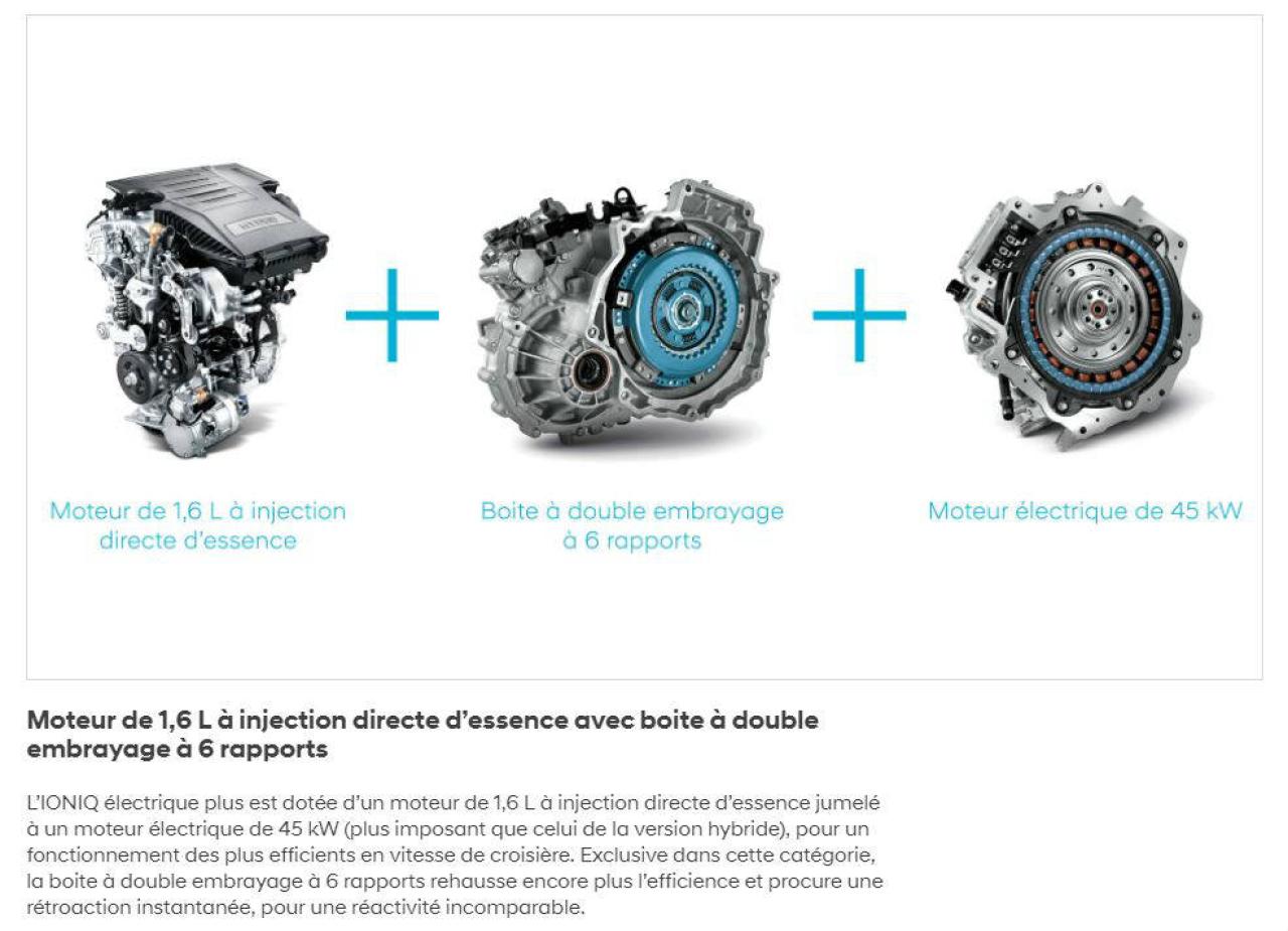 + Moteur de 1,6 L à injection directe d'essence + moteur électrique synchrone intégré à aimants permanents de 45 kW + batterie haute tension au lithium-ion polymère de 8,9 kWh