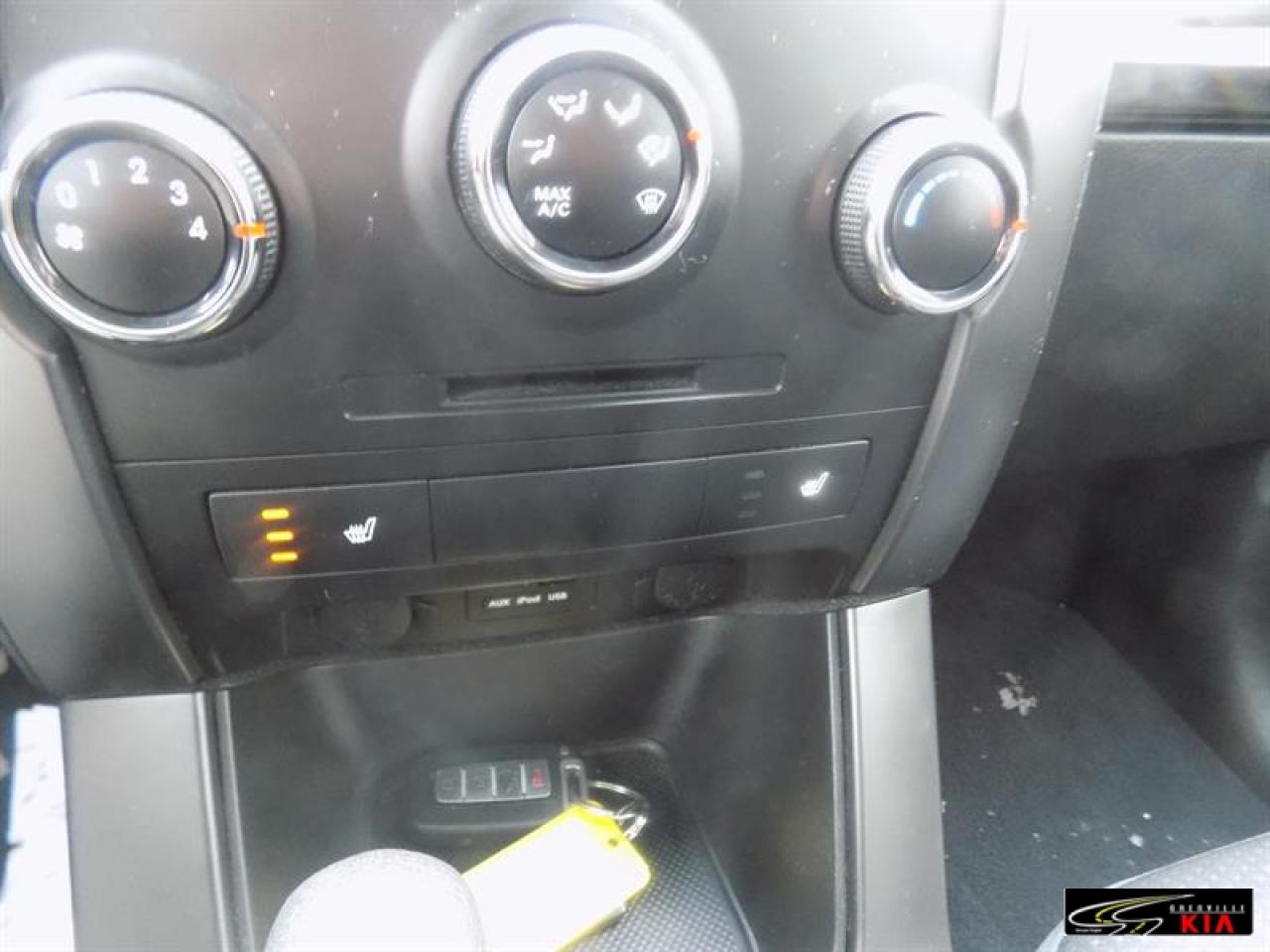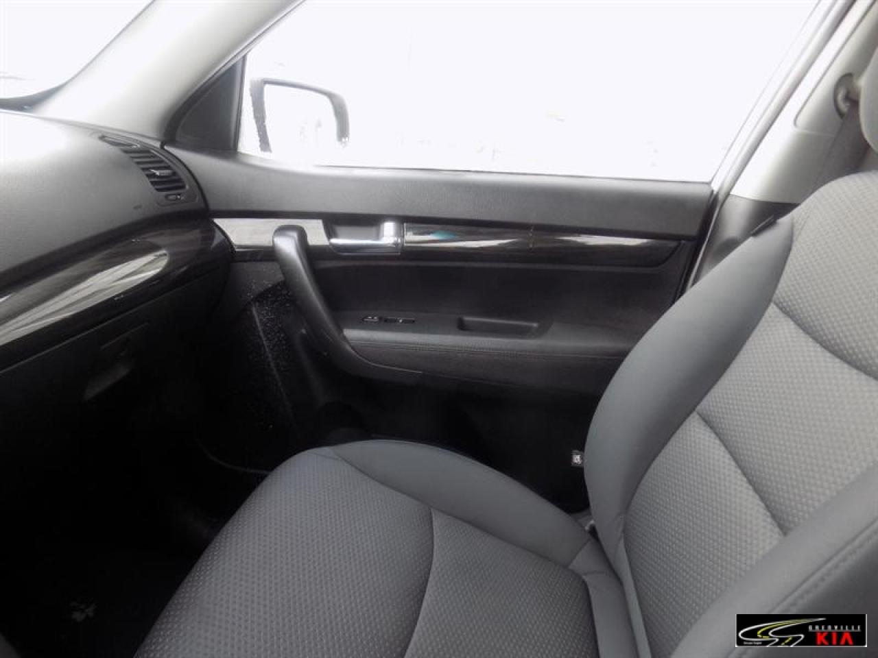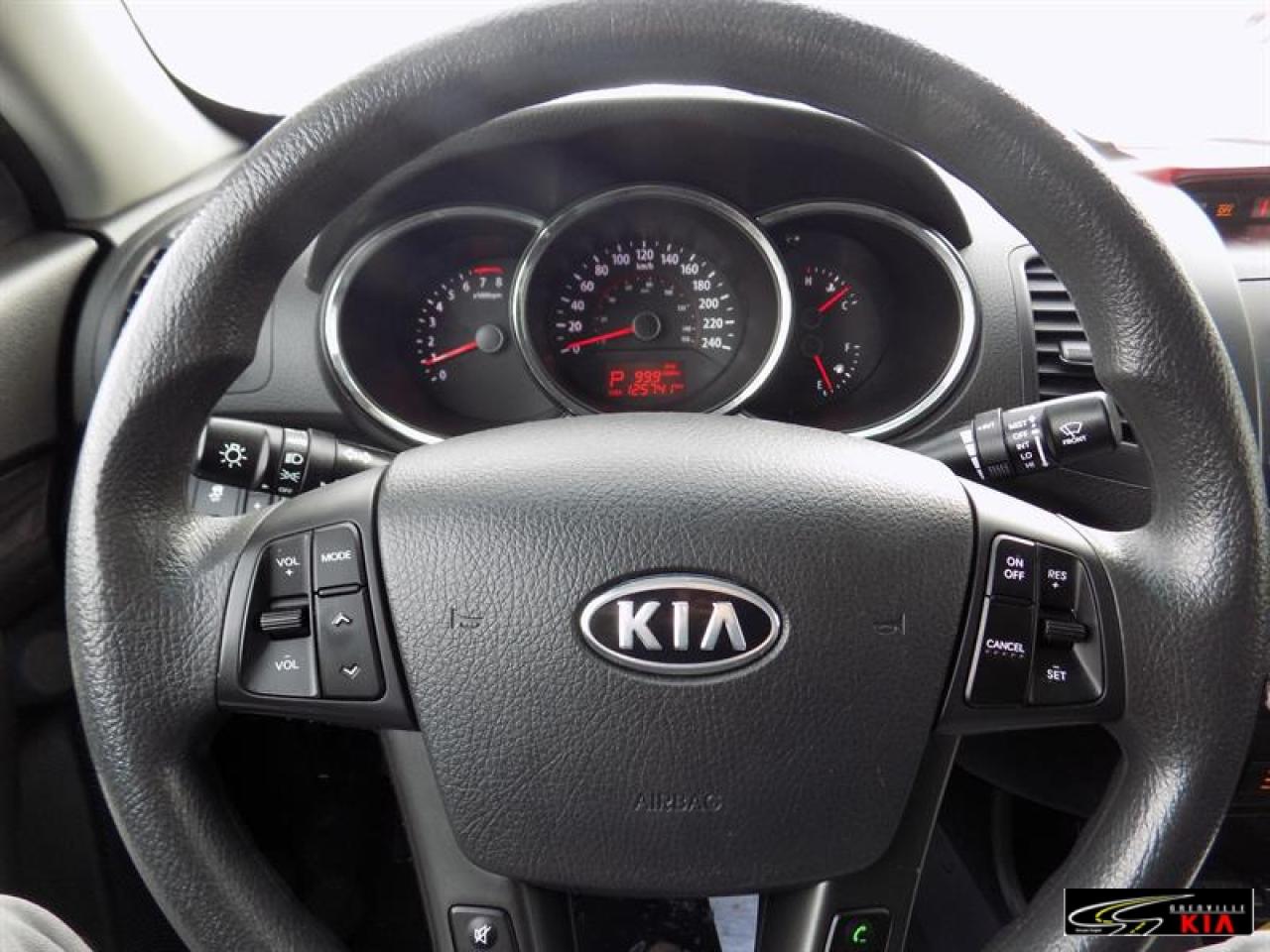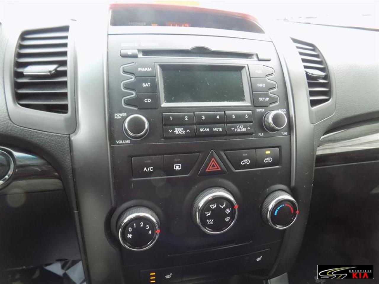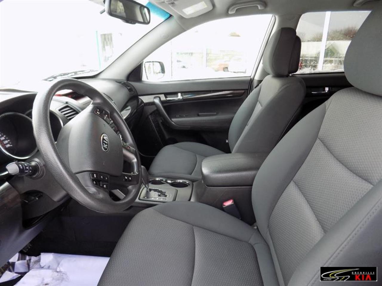 Kia Sorento Fwd 4dr V6 Auto Lx 2012\n\nRégulateur de vitesse, Servo-direction, Essuie-glaces intermittents, Freins ABS, Contrôle de stabilité, Serrure à sécurité pour enfants, Démarreur à distance, Lecteur CD, Lecteur MP3, Miroirs chauffants, Miroirs électriques, Portes électriques, Vitres électriques, Air climatisé, Climatisation deux zones, Commandes audio au volant, Lampes de lecture arrière, Sièges chauffants, Volant ajustable, Vitres teintées, Radio satellite, Ordinateur de bord, Radio AM/FM, Volant gainé de cuir, Phares automatiques, Miroir vanité conducteur illuminé, Régulateur de température, Sièges tissu, Démarrage sans clé, Garnitures intérieures en similibois, Antivol, Antipatinage, Phares antibrouillards, Sièges baquets, Coussin gonflable passager, Miroir vanité passager illuminé\n\n