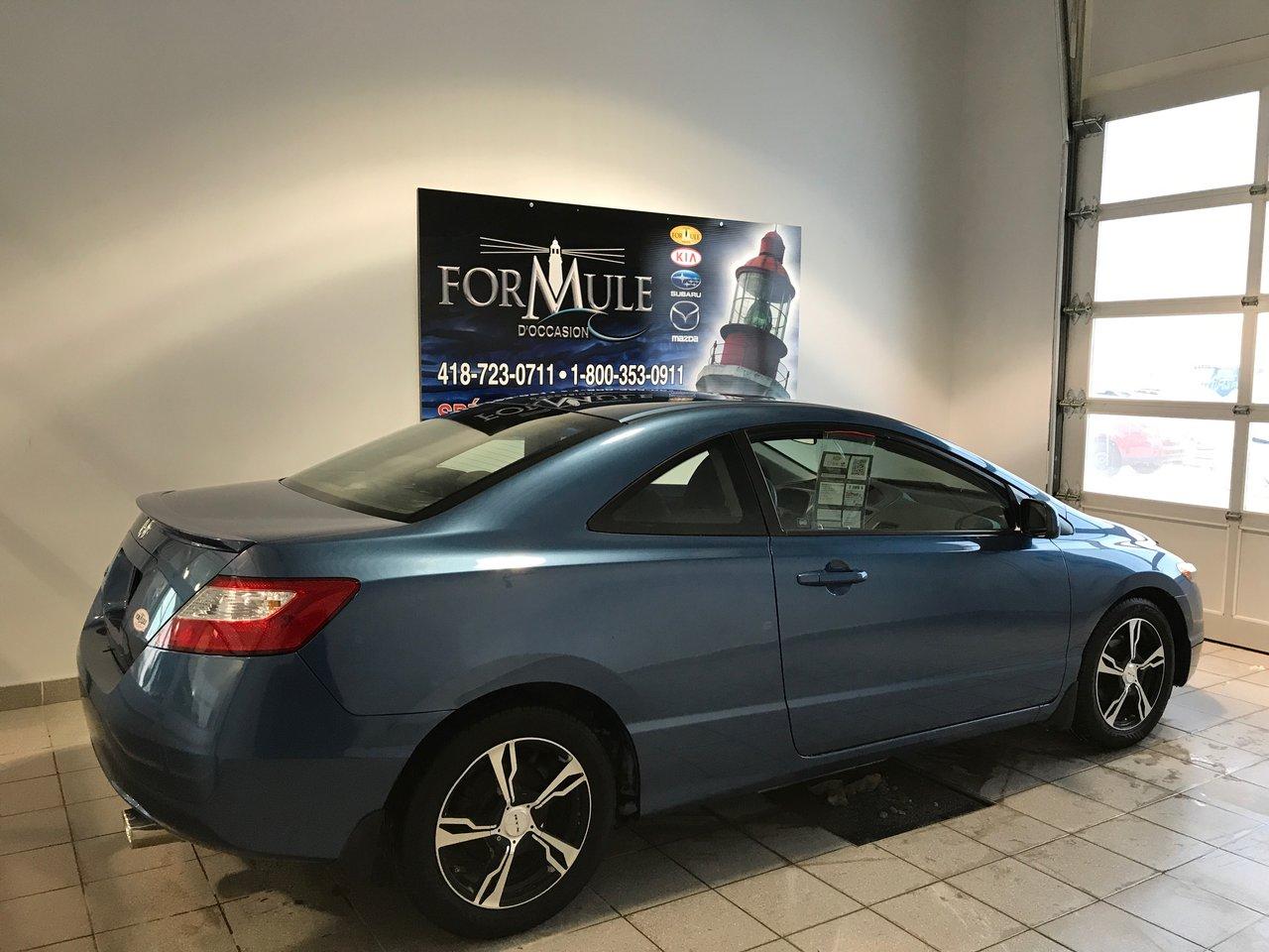 Honda Civic Cpe LX 2008\n\nRégulateur de vitesse, Toit ouvrant, Essuie-glaces intermittents, Anti-démarreur, Freins ABS, Coussin gonflable conducteur, Coussins gonflables latéraux, Lecteur CD, Lecteur MP3, Portes électriques, Vitres électriques, Air climatisé, Lampes de lecture arrière, Volant ajustable, Tapis protecteurs, Rétroviseur électrique, Direction assistée, Rétroviseurs chauffants, Coussins gonflables arrière pour la tête, Sièges tissu, Sièges baquets, Aluminium, Climatisation\n\nPOUR LE PLUS GRAND CHOIX À UN SEUL ENDROIT, LE MEGA CENTRE DE L'USAGÉ DANS L'EST DU QUÉBEC. COUVRANT LA GRANDE RÉGION DE RIMOUSKI, MATANE, MONT-JOLI, RIVIÈRE-DU-LOUP, STE-ANNE DES MONTS, MATAPÉDIA,GASPÉSIE... CONTACTEZ-NOUS SANS FRAIS AU 1-877-864-3666 LIVRAISON PARTOUT AU QUÉBEC.