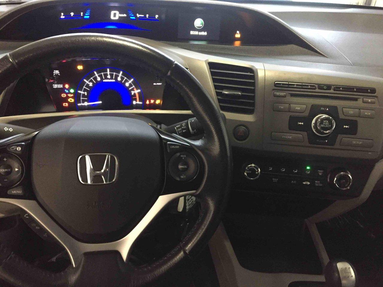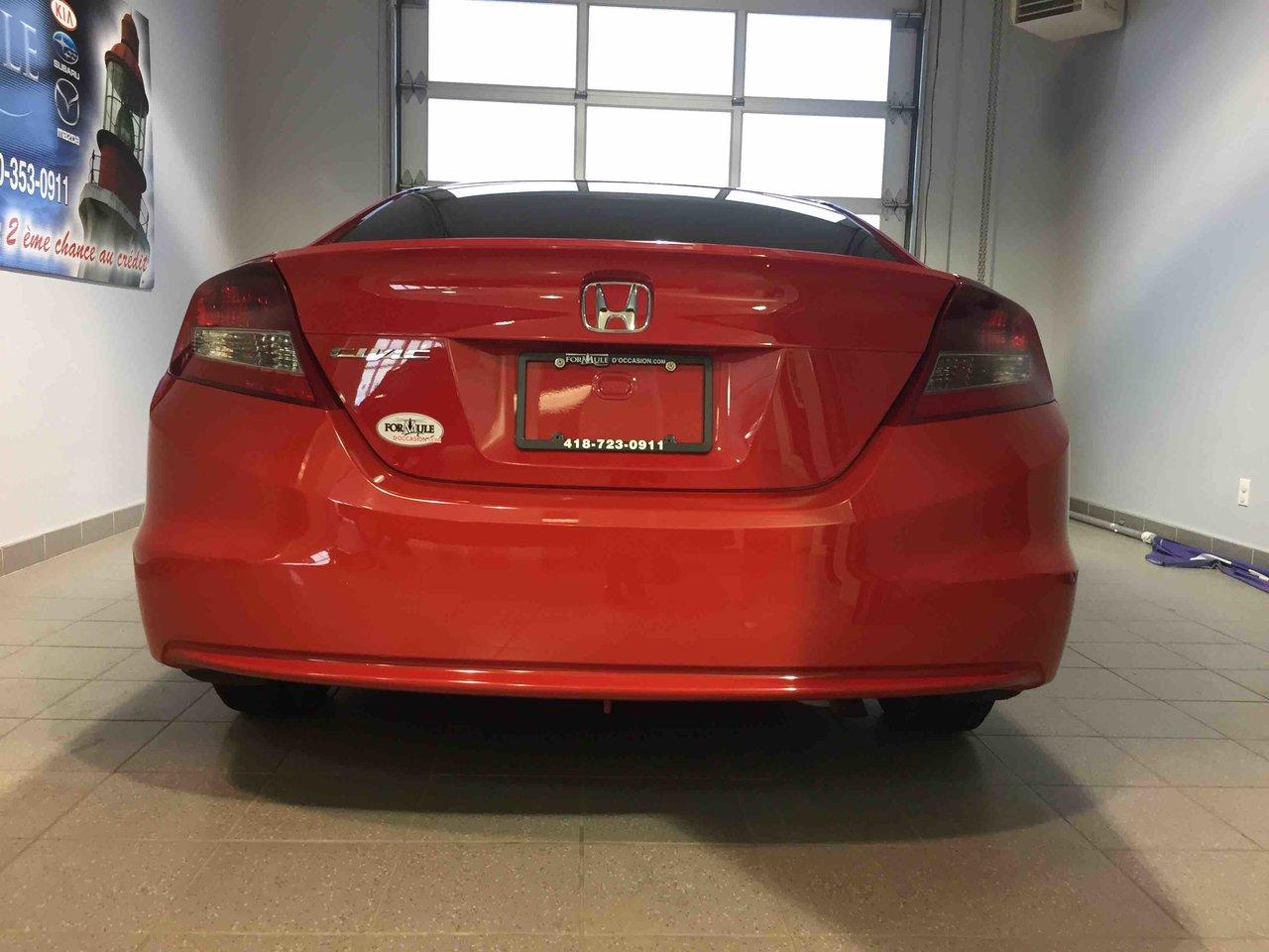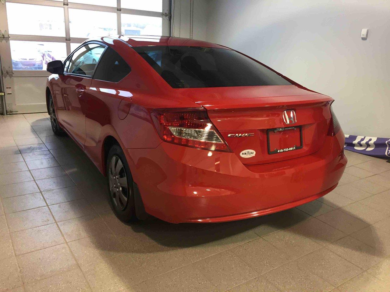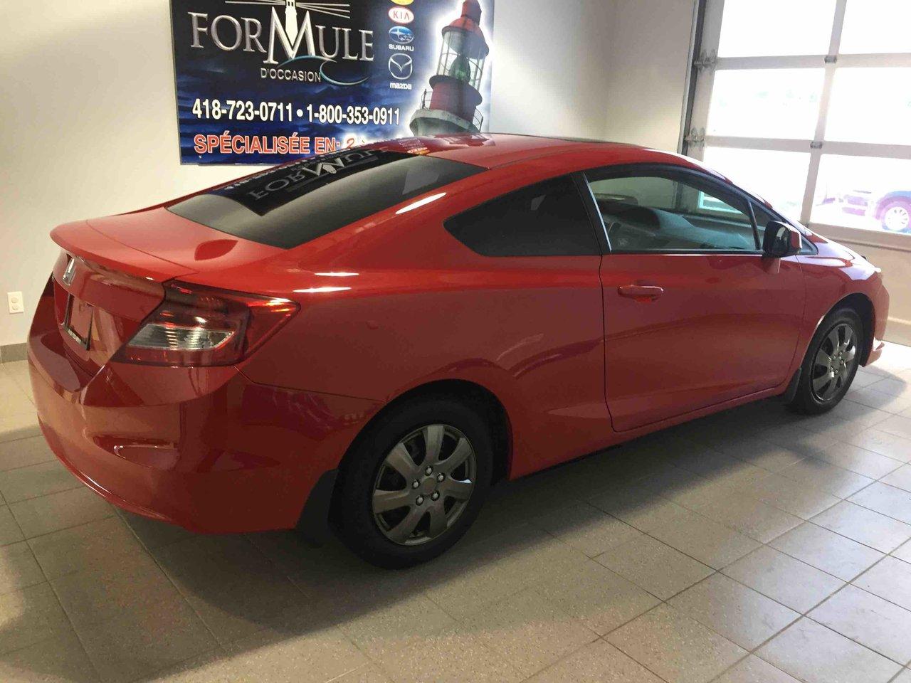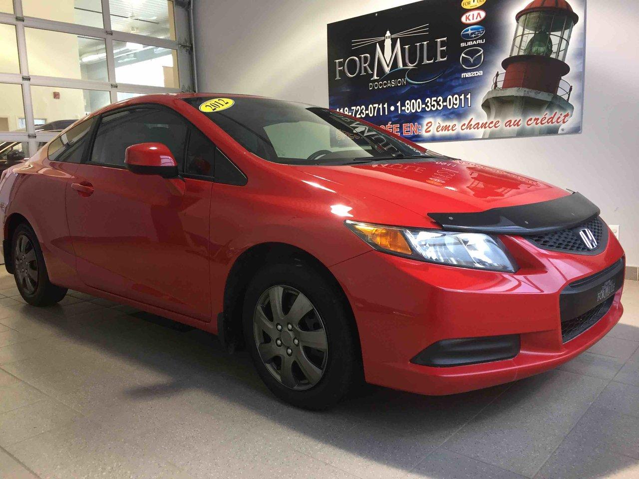 Honda Civic Cpe EX 2012\n\nRégulateur de vitesse, Toit ouvrant, Essuie-glaces intermittents, Anti-démarreur, Freins ABS, Contrôle de stabilité, Coussin gonflable conducteur, Coussins gonflables latéraux, Lecteur CD, Lecteur MP3, Portes électriques, Vitres électriques, Air climatisé, Lampes de lecture arrière, Volant ajustable, Moonroof, Tapis protecteurs, Volant gainé de cuir, Phares automatiques, Rétroviseur électrique, Direction assistée, Rétroviseurs chauffants, Coussins gonflables arrière pour la tête, Sièges tissu, Freins à disque, Antipatinage, Sièges baquets, Technologie Bluetooth intégrée, Aluminium, Climatisation\n\nPOUR LE PLUS GRAND CHOIX À UN SEUL ENDROIT, LE MEGA CENTRE DE L'USAGÉ DANS L'EST DU QUÉBEC. COUVRANT LA GRANDE RÉGION DE RIMOUSKI, MATANE, MONT-JOLI, RIVIÈRE-DU-LOUP, STE-ANNE DES MONTS, MATAPÉDIA,GASPÉSIE... CONTACTEZ-NOUS SANS FRAIS AU 1-877-864-3666 LIVRAISON PARTOUT AU QUÉBEC.
