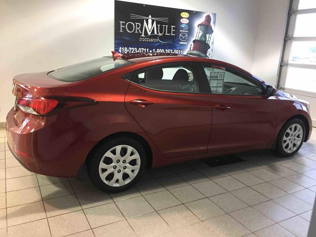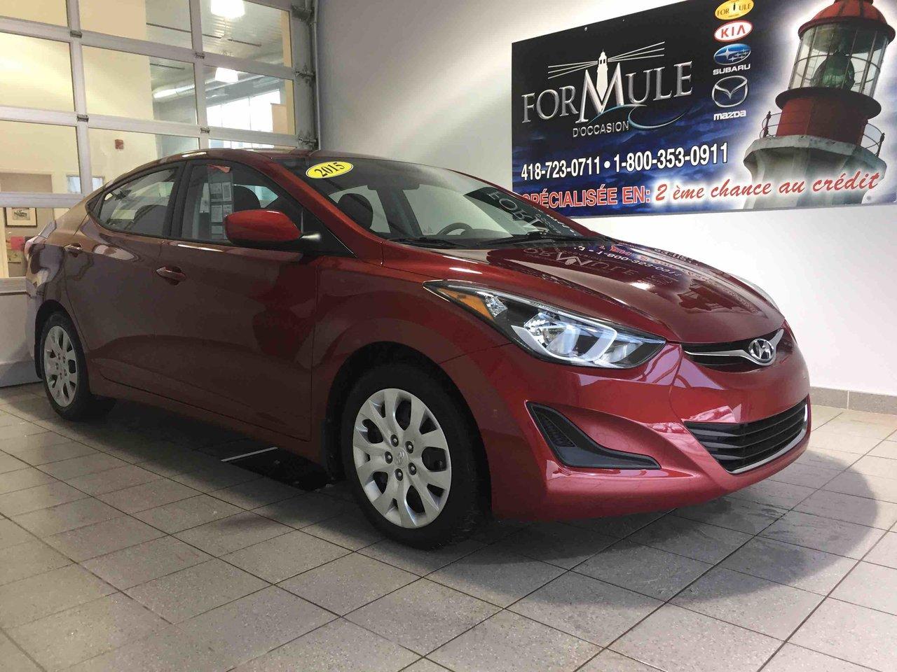 Hyundai Elantra Elantra 2015\n\nEssuie-glaces intermittents, Anti-démarreur, Freins ABS, Contrôle de stabilité, Coussin gonflable conducteur, Coussins gonflables latéraux, Lecteur CD, Lecteur MP3, Portes électriques, Vitres électriques, Air climatisé, Volant ajustable, Tapis protecteurs, Rétroviseur électrique, Direction assistée, Rétroviseurs chauffants, Coussins gonflables arrière pour la tête, Sièges tissu, Freins à disque, Antipatinage, Verrous de sécurité pour enfants, Sièges baquets\n\nPOUR LE PLUS GRAND CHOIX À UN SEUL ENDROIT, LE MEGA CENTRE DE L'USAGÉ DANS L'EST DU QUÉBEC. COUVRANT LA GRANDE RÉGION DE RIMOUSKI, MATANE, MONT-JOLI, RIVIÈRE-DU-LOUP, STE-ANNE DES MONTS, MATAPÉDIA,GASPÉSIE... CONTACTEZ-NOUS SANS FRAIS AU 1-877-864-3666 LIVRAISON PARTOUT AU QUÉBEC.