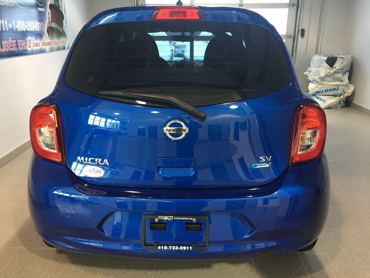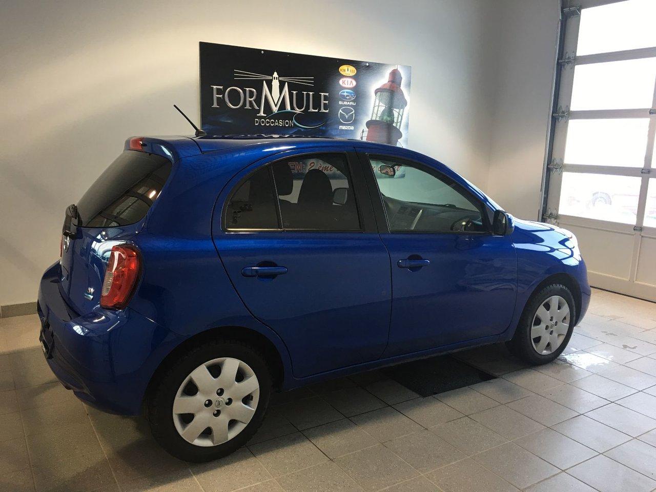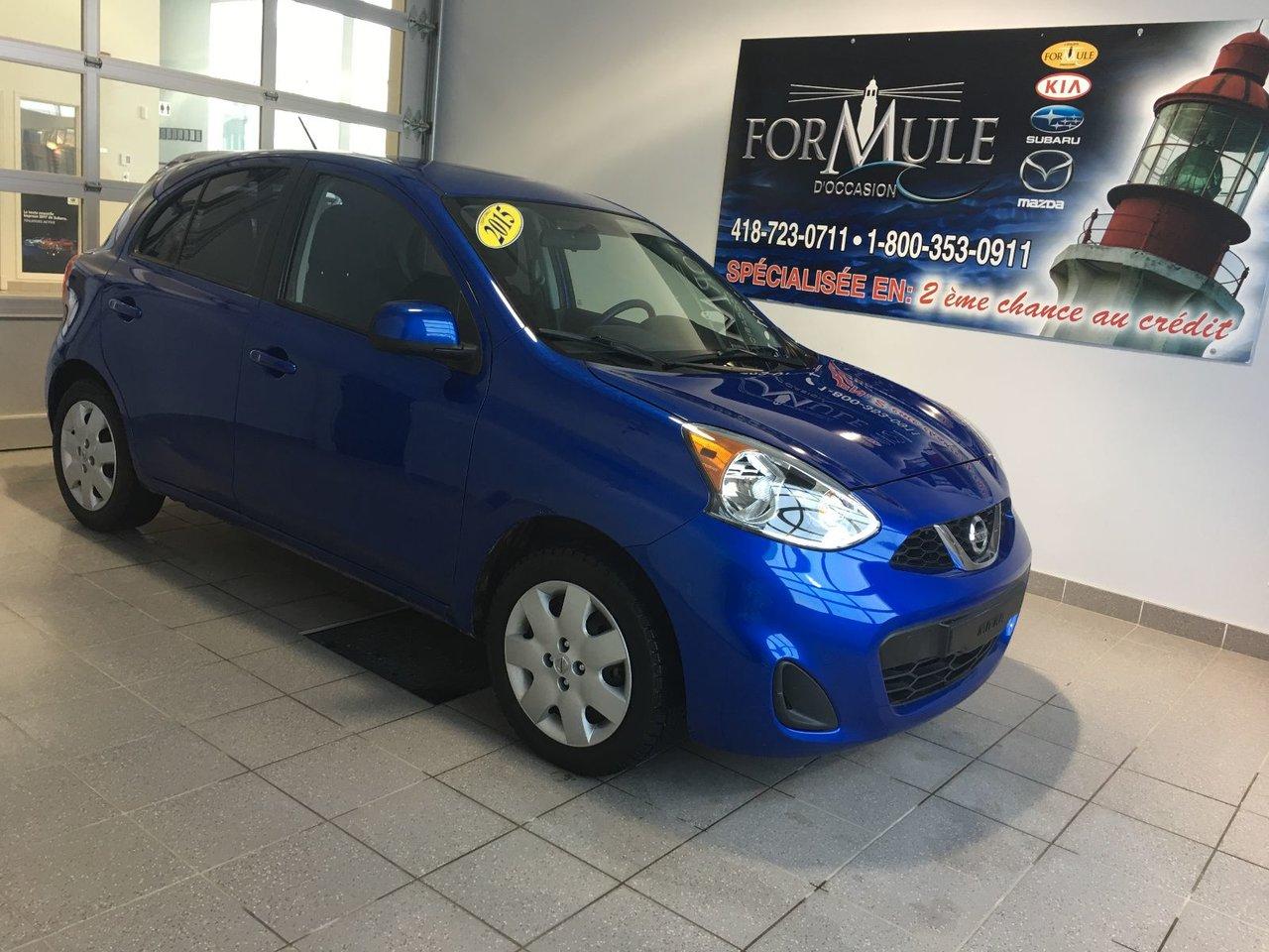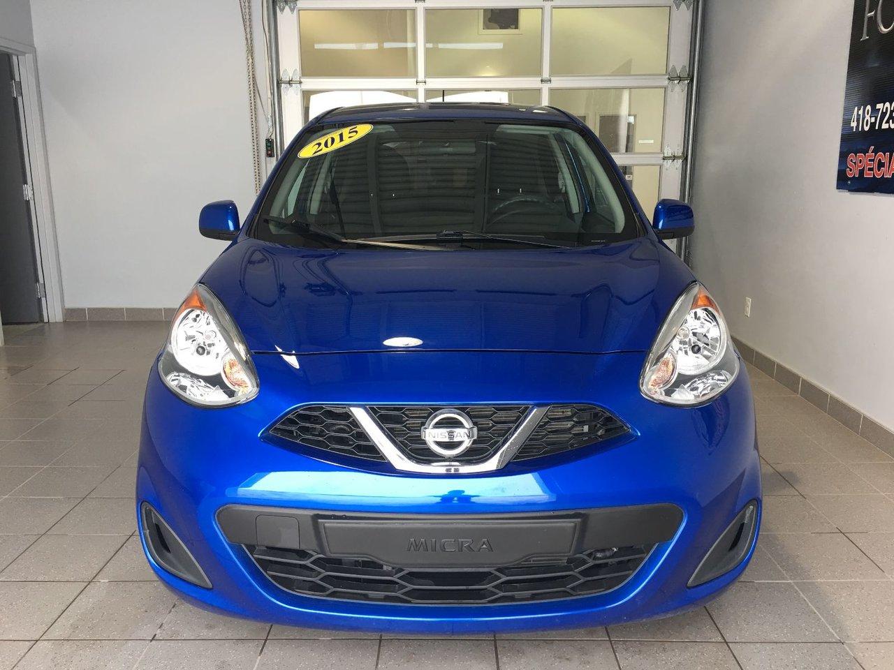 Nissan Micra SV 2015\n\nEssuie-glaces intermittents, Anti-démarreur, Freins ABS, Contrôle de stabilité, Coussin gonflable conducteur, Coussins gonflables latéraux, Lecteur CD, Lecteur MP3, Portes électriques, Vitres électriques, Air climatisé, Volant ajustable, Tapis protecteurs, Phares automatiques, Direction assistée, Coussins gonflables arrière pour la tête, Sièges tissu, Freins à disque, Antipatinage, Verrous de sécurité pour enfants, Sièges baquets\n\nPOUR LE PLUS GRAND CHOIX À UN SEUL ENDROIT, LE MEGA CENTRE DE L'USAGÉ DANS L'EST DU QUÉBEC. COUVRANT LA GRANDE RÉGION DE RIMOUSKI, MATANE, MONT-JOLI, RIVIÈRE-DU-LOUP, STE-ANNE DES MONTS, MATAPÉDIA,GASPÉSIE... CONTACTEZ-NOUS SANS FRAIS AU 1-877-864-3666 LIVRAISON PARTOUT AU QUÉBEC.