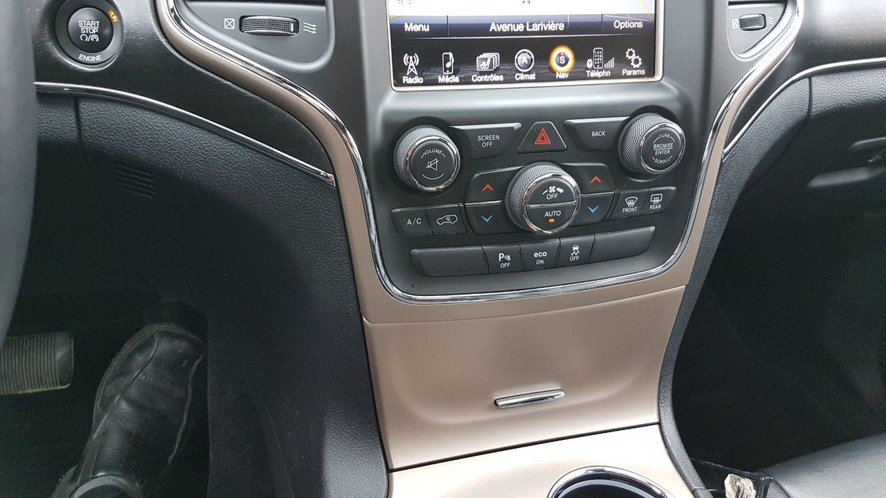 Jeep Grand Cherokee Limited TRES BAS KM 2015Régulateur de vitesse, Toit ouvrant, Essuie-glaces intermittents, Essuie-glace arrière, Anti-démarreur, Freins ABS, Contrôle de stabilité, Coussin gonflable conducteur, Coussins gonflables latéraux, Démarreur à distance, Lecteur CD, Lecteur MP3, 6 Haut-parleurs, Portes électriques, Tachymètre, Vitres électriques, Air climatisé, Intérieur en cuir, Climatisation deux zones, Commandes audio au volant, Sièges arrières rabattables, Sièges chauffants, Siège mémoire, Volant ajustable, Tapis protecteurs, Vitres teintées, Attelage remorque, Phares haute intensité, Ordinateur de bord, Tout équipé, Caméra de recul, Radio AM/FM, Rétroviseurs, Volant gainé de cuir, Phares automatiques, Rétroviseur électrique, Sièges arrières chauffants, Direction assistée, Télédéverrouillage, Rétroviseurs chauffants, Banquette arrière divisé, Siège à réglage électrique, Système d\'alarme, Coussins gonflables arrière pour la tête, Siège conducteur - soutien lombaire, Siège passager - soutien lombaire, Essuie-glace détecteur de pluie, Démarrage sans clé, Freins à disque, Sièges chauffants - Avant, Rétroviseurs électriques, Jantes en alliage, Antipatinage, Phares antibrouillards, Verrous de sécurité pour enfants, Système de surveillance de la pression des pneus, Sièges baquets, Prise Auxiliaire, Technologie Bluetooth intégrée, Port USB, Climatiseur automatique, Aide au stationnement (capteurs), Cache bagages, Coussin gonflable - Commutateur de mise en/hors fo, Rétroviseur à atténuation automatique, Aluminium, Climatisation, Volant chauffant
