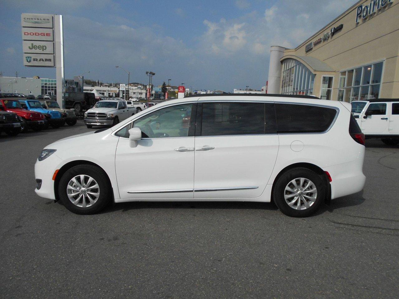 Chrysler Pacifica Touring 2017Régulateur de vitesse, Essuie-glaces intermittents, Essuie-glace arrière, Anti-démarreur, Freins ABS, Contrôle de stabilité, Coussin gonflable conducteur, Démarreur à distance, Chauffe-moteur, 6 Haut-parleurs, Miroirs chauffants, Portes électriques, Sièges électriques, Tachymètre, Téléphone cellulaire, Vitres électriques, Air climatisé, Intérieur en cuir, Banquette de troisième rangée, Chauffage arrière, Climatisation deux zones, Commandes audio au volant, Sièges arrières rabattables, Sièges chauffants, Volant ajustable, Deux portes coulissantes, Tapis protecteurs, Vitres teintées, Radio satellite, Ordinateur de bord, Tout équipé, Caméra de recul, Horloge, Radio AM/FM, Rétroviseurs, Direction assistée, Télédéverrouillage, Rétroviseurs chauffants, Banquette arrière divisé, Siège à réglage électrique, Système d\'alarme, Démarrage sans clé, Rétroviseurs électriques, Jantes en alliage, Antipatinage, Phares antibrouillards, Coussins gonflables, Support à bagages, Verrous de sécurité pour enfants, Système de surveillance de la pression des pneus, Dégivreur de lunette arrière, Miroirs ajustables de l\'intérieur, Prise Auxiliaire, Points d\'ancrage pour sièges d\'enfant, Technologie Bluetooth intégrée, Port USB, Climatiseur automatique, Pare-chocs de couleur assortie
