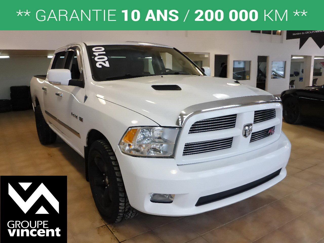 Dodge RAM 1500 SPORT 4X4**GARANTIE 10 ANS** Parfait pour le travail et les loisirs ! 2010Régulateur de vitesse, Essuie-glaces intermittents, Anti-démarreur, Freins ABS, Contrôle de stabilité, Coussin gonflable conducteur, Coussins gonflables latéraux, Lecteur CD, Lecteur MP3, 6 Haut-parleurs, Portes électriques, Tachymètre, Vitres électriques, Air climatisé, Intérieur en cuir, Sièges chauffants, Volant ajustable, Marchepieds, Ordinateur de bord, Radio AM/FM, Phares automatiques, Rétroviseur électrique, Direction assistée, Télédéverrouillage, Rétroviseurs chauffants, Siège à réglage électrique, Système d\'alarme, Coussins gonflables arrière pour la tête, Freins à disque, Rétroviseurs électriques, Jantes en alliage, Antipatinage, Phares antibrouillards, Système de surveillance de la pression des pneus, Roue de secours - Temporaire, Climatisation