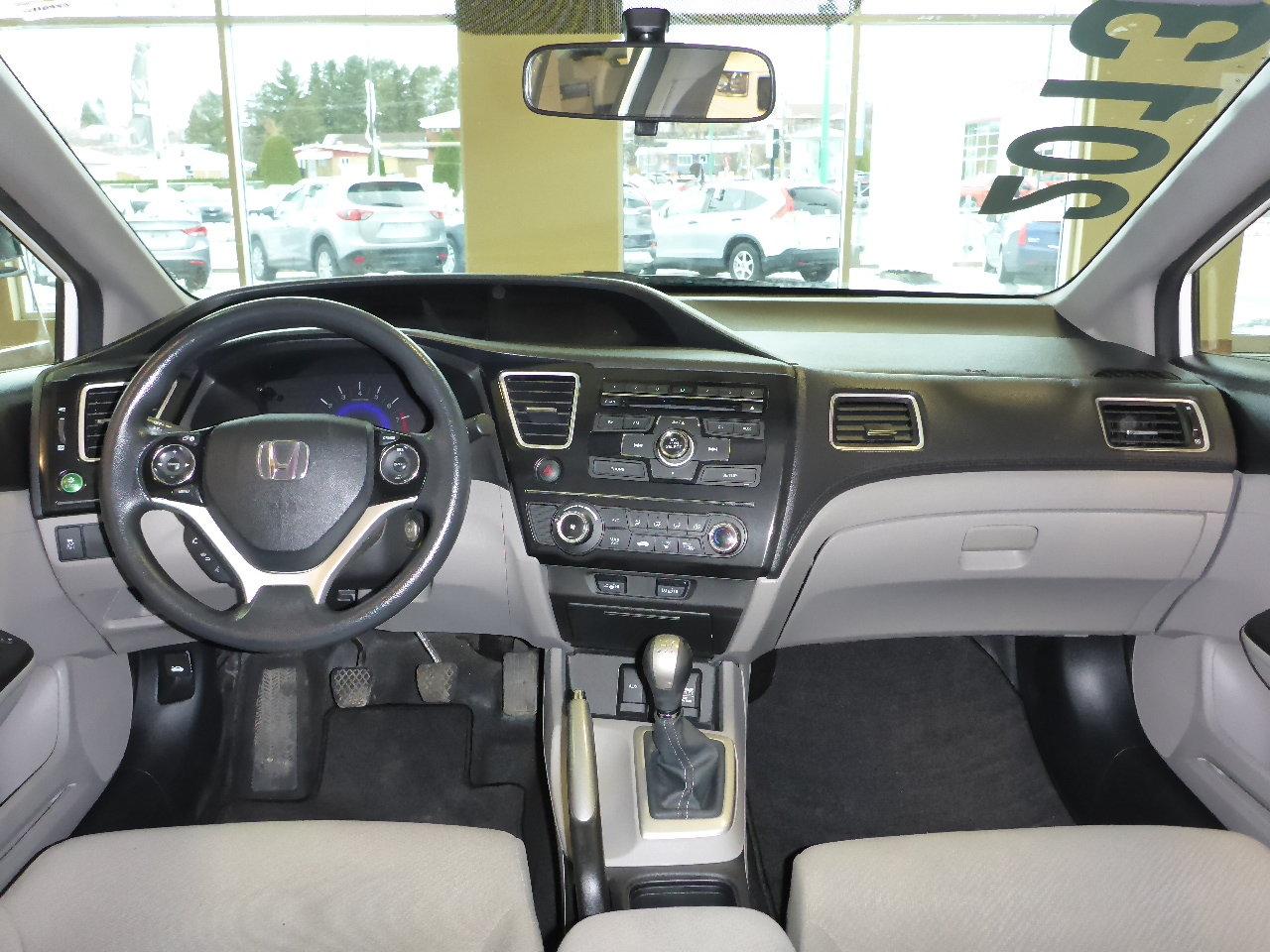 Honda Civic LX**CLIMATISEUR** Fiable et ?conomique ! 2013Régulateur de vitesse, Essuie-glaces intermittents, Anti-démarreur, Freins ABS, Contrôle de stabilité, Coussin gonflable conducteur, Coussins gonflables latéraux, Lecteur CD, Lecteur MP3, 6 Haut-parleurs, Portes électriques, Tachymètre, Vitres électriques, Air climatisé, Commandes audio au volant, Lampes de lecture arrière, Sièges arrières rabattables, Volant ajustable, Enjoliveurs, Tapis protecteurs, Ordinateur de bord, Radio AM/FM, Phares automatiques, Rétroviseur électrique, Direction assistée, Rétroviseurs chauffants, Banquette arrière divisé, Système d\'alarme, Coussins gonflables arrière pour la tête, Sièges tissu, Freins à disque, Sièges chauffants - Avant, Rétroviseurs électriques, Antipatinage, Verrous de sécurité pour enfants, Sièges baquets, Prise Auxiliaire, Technologie Bluetooth intégrée, Port USB, Climatisation
