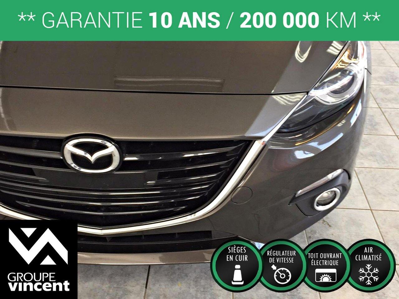Mazda 3 GT-SKY**CUIR** D?marreur ? distance! 2014Régulateur de vitesse, Toit ouvrant, Essuie-glaces intermittents, Anti-démarreur, Freins ABS, Contrôle de stabilité, Coussin gonflable conducteur, Coussins gonflables latéraux, Démarreur à distance, Lecteur CD, Lecteur MP3, 6 Haut-parleurs, Portes électriques, Vitres électriques, Air climatisé, Intérieur en cuir, Climatisation deux zones, Commandes audio au volant, Sièges chauffants, Volant ajustable, Moonroof, Tapis protecteurs, Ordinateur de bord, Tout équipé, Caméra de recul, Volant gainé de cuir, Phares automatiques, Rétroviseur électrique, Direction assistée, Télédéverrouillage, Rétroviseurs chauffants, Siège à réglage électrique, Système d\'alarme, Coussins gonflables arrière pour la tête, Sièges tissu, Essuie-glace détecteur de pluie, Démarrage sans clé, Freins à disque, Sièges chauffants - Avant, Rétroviseurs électriques, Jantes en alliage, Antipatinage, Phares antibrouillards, Verrous de sécurité pour enfants, Sièges baquets, Prise Auxiliaire, Technologie Bluetooth intégrée, Climatiseur automatique, Aluminium, Climatisation