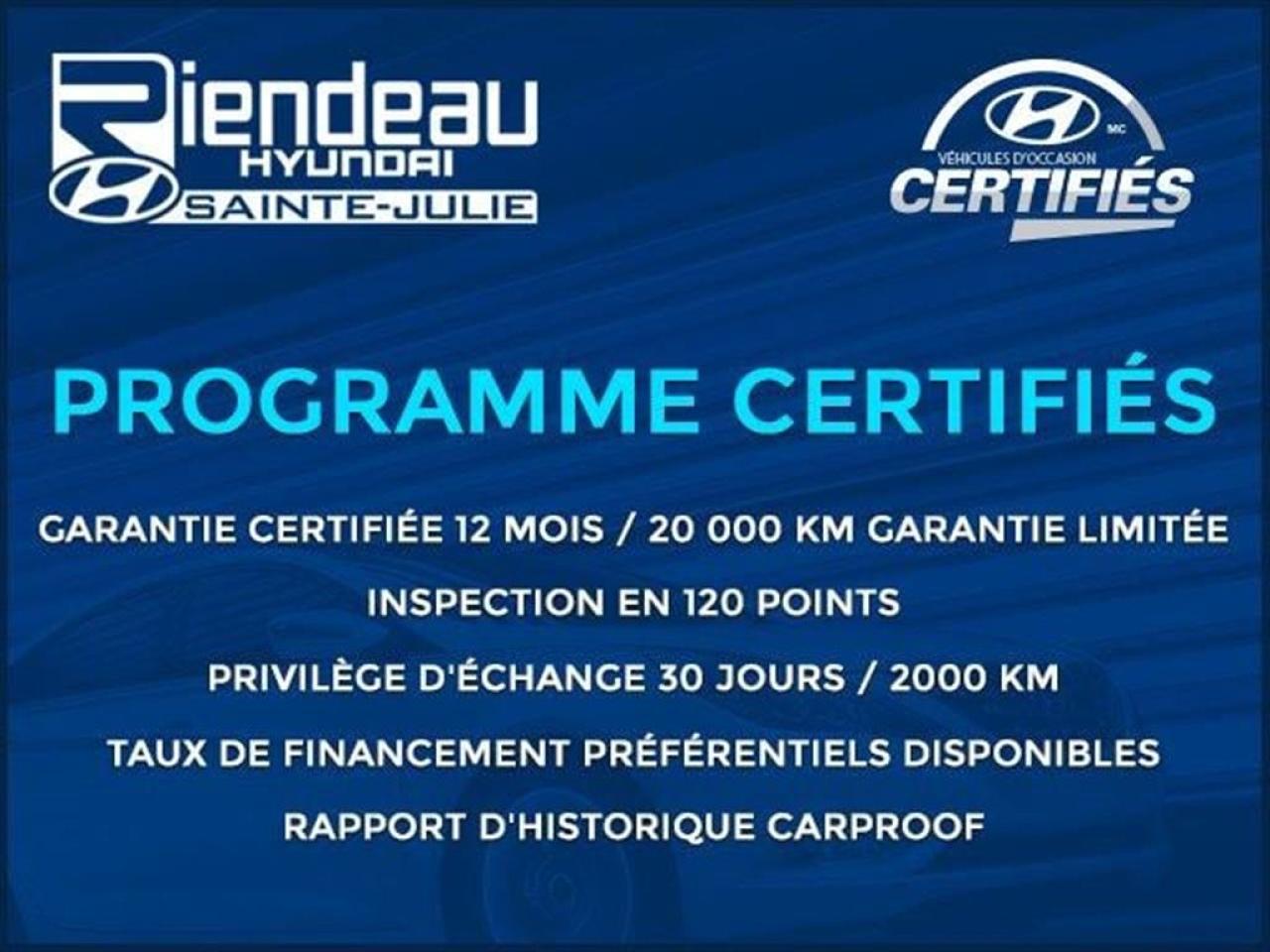 VÉHICULE AUTOMATIQUE, TOIT OUVRANT PANORAMIQUE, SIÈGE CHAUFFANT, AIR CLIMATISÉ, RÉGULATEUR DE VITESSE, PHARES ANTI-BROUILLARD, SIÈGE CONDUCTEUR ÉLECTRIQUE, BLUETOOTH, MAGS 16''...rabais de 500$ au financement déjà inclus dans le prix affiché RIENDEAU HYUNDAI Un concessionnaire établi depuis 1993 ayant vue 3 générations. Ouvert le samedi de 10h à 16h Rejoignez-nous en tout temps au 514-709-2886. Vous manquez de temps pour venir nous visiter? Laissez-nous le savoir et profitez de notre service de visite à domicile ou au travail selon votre horaire! Sachez que tous nos véhicules sont inspectés par nos techniciens certifiés Hyundai et qu'un rapport Carproof est disponible en tout temps sur demande. Venez faire l'expérience Riendeau Hyundai et choisissez parmi notre vaste inventaire de véhicules d'occasion avec des taux certifiés à partir de 2.9% et demandez à propos de nos promotions sur nos pneus d'hivers. À proximité de Montréal, Longueuil, Brossard, St-Hubert, St-Hyacinthe, Drummondville, Saint-Basile-le-Grand, Boucherville, Varennes et Chambly. Venez constatez pourquoi tant de clients choisissent Riendeau Hyundai et rien d'autre. ================================================================ A dealer establish since 1993 and with 3 generations. Open on Saturday from 10h to 16h. Call us anytime at 514-709-2886. Lacking time to visit us? Let us know and benefit of our home and office service following your schedule. Know that our vehicles are inspected by our Hyundai certified technicians and that a Carproof report is available at anytime on demand. Come meet the experience Riendeau Hyundai and chose within our massive inventory of used car with certified interest rate starting at 2.9% and ask us about our promotion on winter tires. Close to Montreal, Longueuil, Brossard, St-Hubert, Ste-Hyacinthe, Drummondville, Saint-Basile-le-Grand, Boucherville, Varennes and Chambly. Let us show you why so many customer choose Riendeau Hyundai and nothing else!