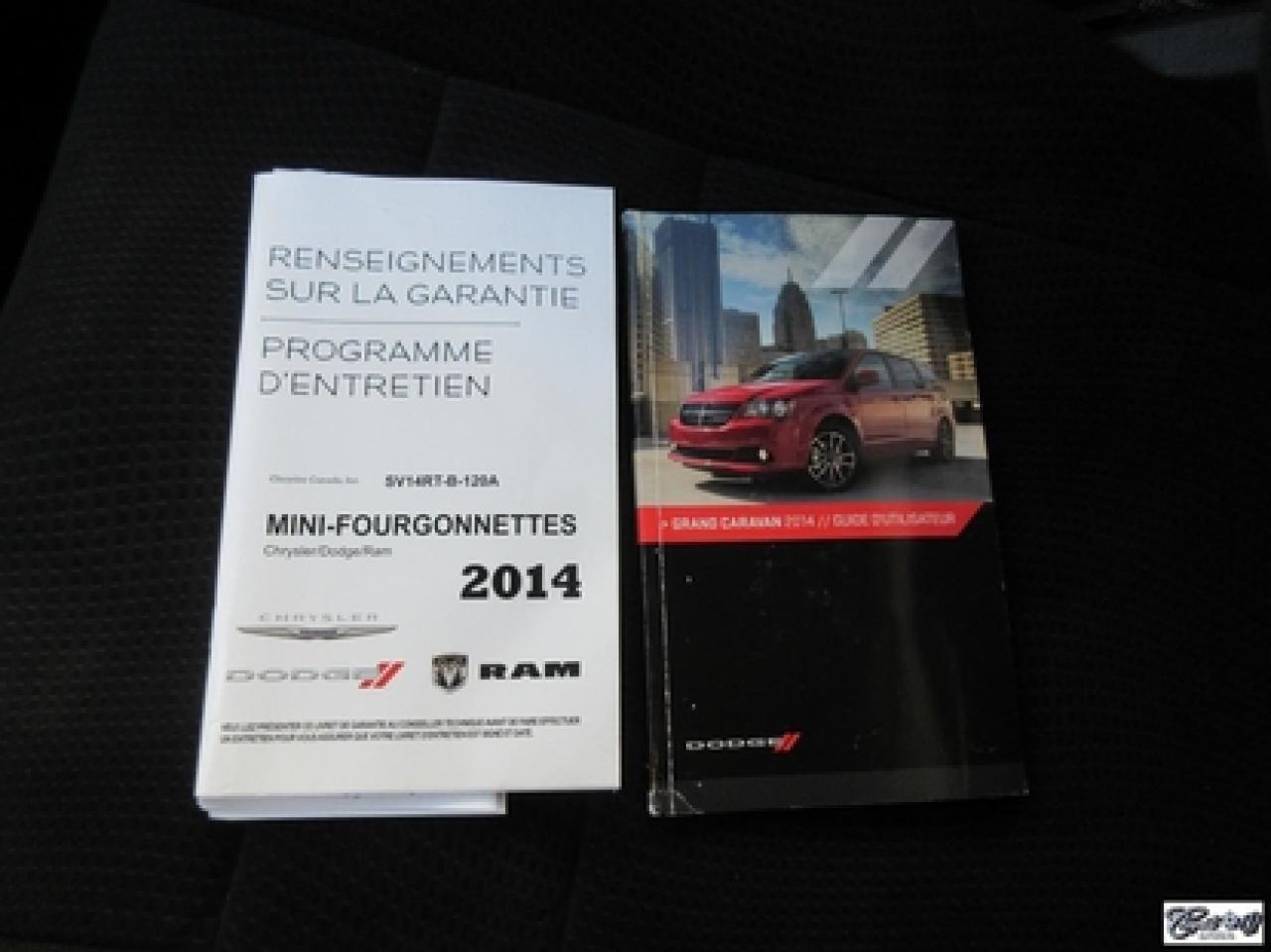 Dodge Grand Caravan SXT 2014\n\nRégulateur de vitesse, Essuie-glaces intermittents, Essuie-glace arrière, Anti-démarreur, Freins ABS, Contrôle de stabilité, Coussin gonflable conducteur, Démarreur à distance, Lecteur CD, Lecteur MP3, Chauffe-moteur, Miroirs chauffants, Portes électriques, Sièges électriques, Tachymètre, Vitres électriques, Air climatisé, Banquette de troisième rangée, Chauffage arrière, Climatisation deux zones, Commandes audio au volant, Sièges arrières rabattables, Volant ajustable, Aileron, Deux portes coulissantes, Moulures protectrices latérales, Tapis protecteurs, Vitres teintées, Ordinateur de bord, Radio AM/FM, Protège-capot, Direction assistée, Télédéverrouillage, Rétroviseurs électriques, Jantes en alliage, Antipatinage, Phares antibrouillards, Coussins gonflables, Support à bagages, Verrous de sécurité pour enfants, Système de surveillance de la pression des pneus, Dégivreur de lunette arrière, Miroirs ajustables de l'intérieur, Sièges baquets, Port USB\n\nBALANCE DE GARANTIE PROLONGÉE PLAN OR GLOBALE JUSQU'AU 5 MARS 2019 OU 100000 KM!!! Edition spéciale BLACKTOP, climatisation et chauffage arrière, vitre électriques dans les portes coulissantes, dem. à distance, gr. électrique, déflecteur de capot, STOW N' GO COMPLET (sièges qui entrent dans le plancher), bien entretenu, très bas kilométrage, faut voir!!! Carproof disponible, aucun accident...