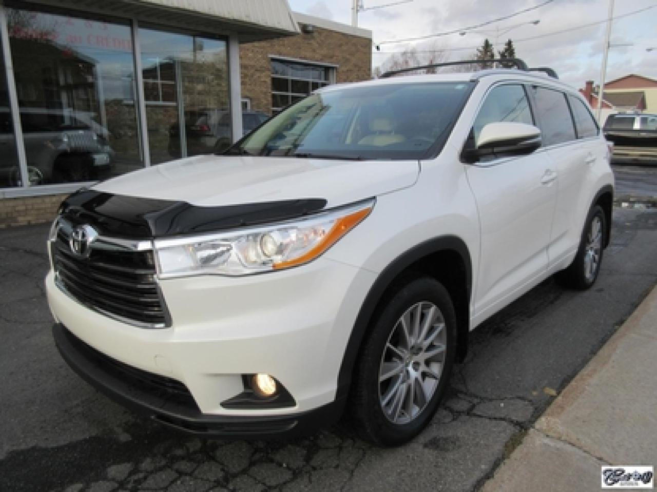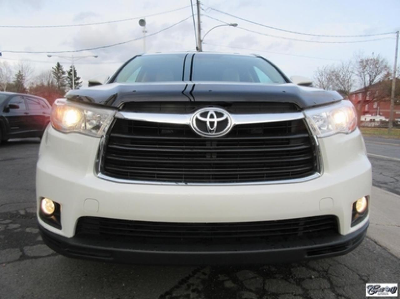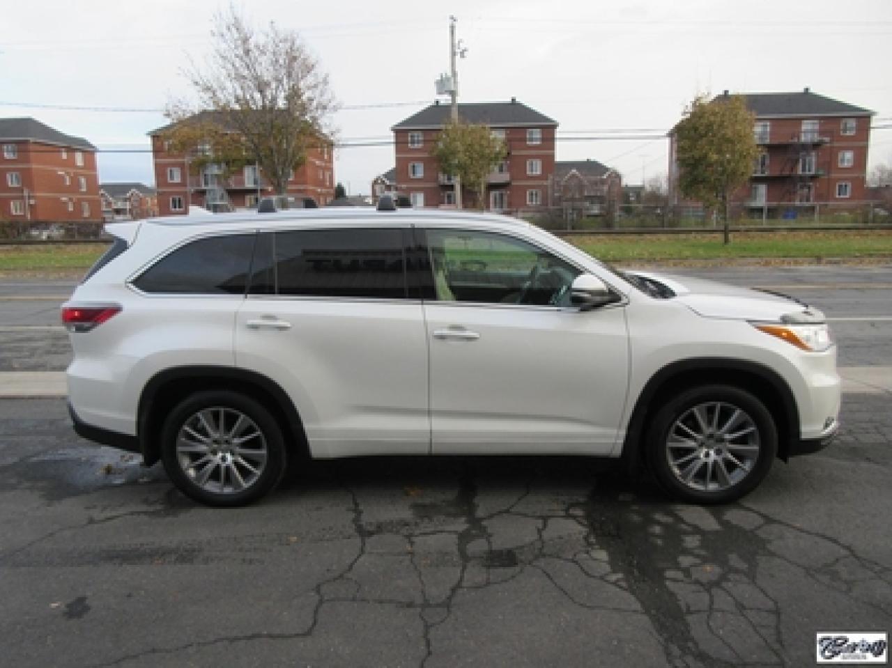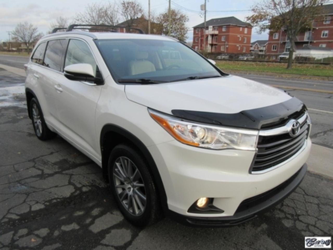 Toyota Highlander Xle V6 Awd 2015\n\nRégulateur de vitesse, Toit ouvrant, Essuie-glaces intermittents, Essuie-glace arrière, Anti-démarreur, Freins ABS, Contrôle de stabilité, Coussin gonflable conducteur, Lecteur CD, Lecteur MP3, Coffre - Ouverture à distance, Miroirs chauffants, Portes électriques, Sièges électriques, Tachymètre, Vitres électriques, Air climatisé, Intérieur en cuir, Banquette de troisième rangée, Chauffage arrière, Climatisation deux zones, Commandes audio au volant, Sièges arrières rabattables, Sièges chauffants, Volant ajustable, Aileron, Tapis protecteurs, Vitres teintées, Attelage remorque, Radio satellite, Ordinateur de bord, Caméra de recul, Radio AM/FM, Protège-capot, Direction assistée, Télédéverrouillage, Système d'alarme, Rétroviseurs électriques, Jantes en alliage, Antipatinage, Phares antibrouillards, Coussins gonflables, Support à bagages, Verrous de sécurité pour enfants, Système de surveillance de la pression des pneus, Dégivreur de lunette arrière, Miroirs ajustables de l'intérieur, Sièges baquets, Technologie Bluetooth intégrée, Port USB, Climatiseur automatique, Système HomeLink\n\nWOW!!! Blanc perle intérieur en cuir tan, 4 PNEUS HIVER SUR RIMS INCLUS, toit ouvrant, navigation, caméra de recul, climatisation et chauffage arrière, 8 PASSAGERS, gr. électrique, sièges chauffants, entrée sans clé, "bluetooth", hayon électrique, système de repérage TAG, attache-remorque et +++. Capacité de remorquage de 5000 lbs, un très beau VUS luxueux, spacieux et fiable!!! Carproof disponible...