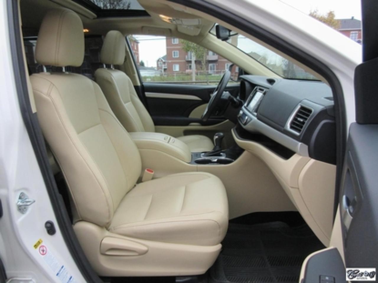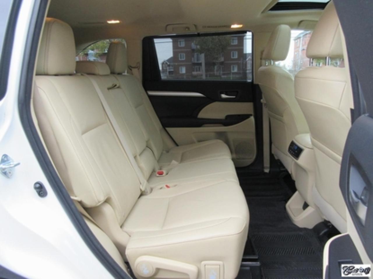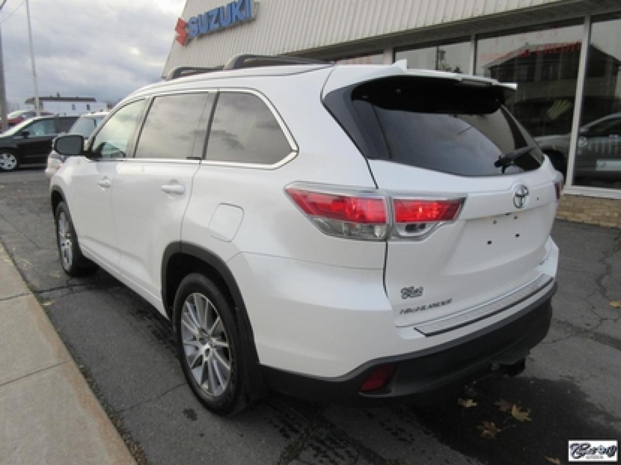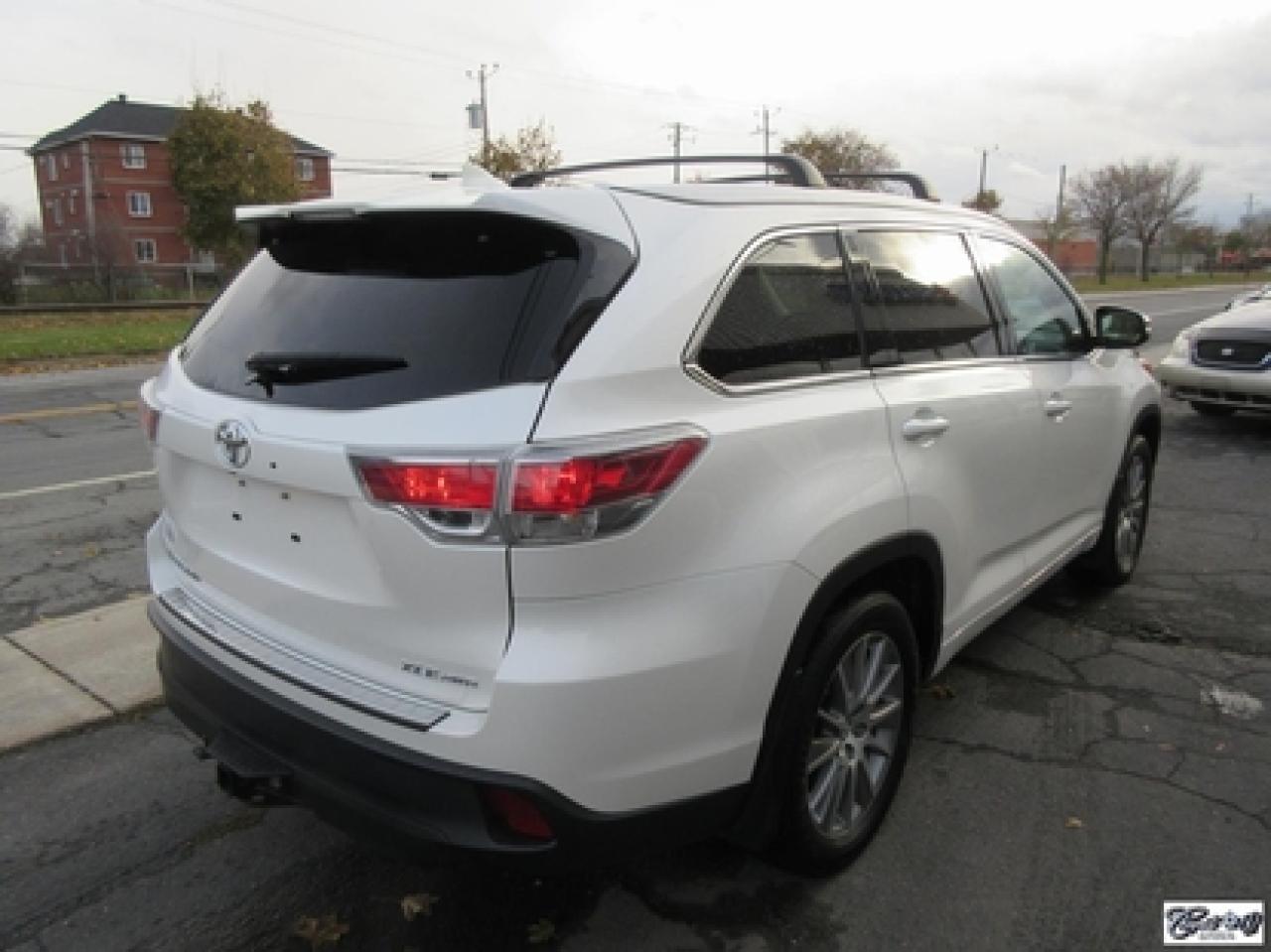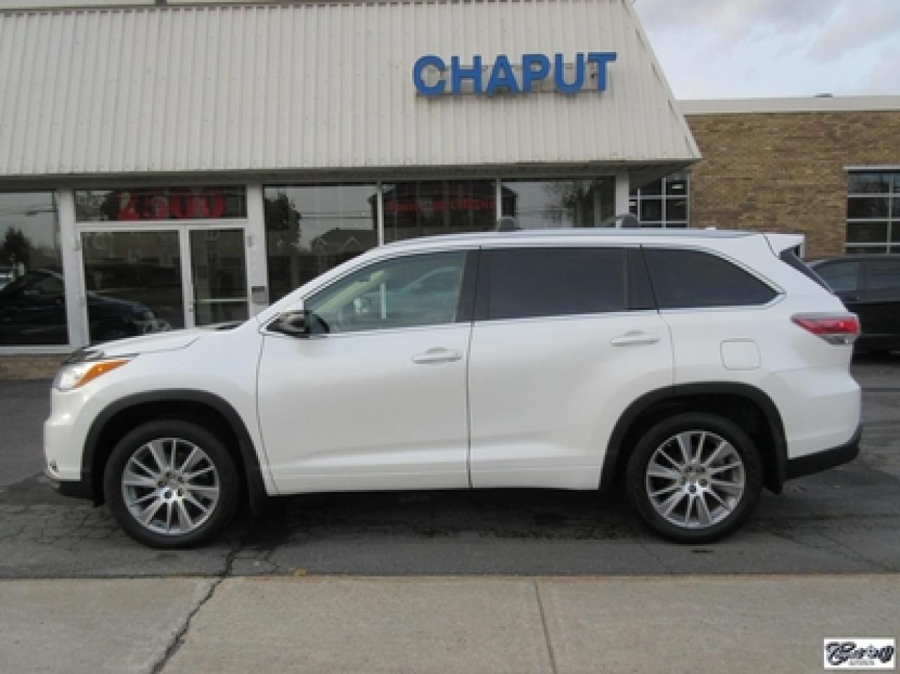 Toyota Highlander Xle V6 Awd 2015\n\nRégulateur de vitesse, Toit ouvrant, Essuie-glaces intermittents, Essuie-glace arrière, Anti-démarreur, Freins ABS, Contrôle de stabilité, Coussin gonflable conducteur, Lecteur CD, Lecteur MP3, Coffre - Ouverture à distance, Miroirs chauffants, Portes électriques, Sièges électriques, Tachymètre, Vitres électriques, Air climatisé, Intérieur en cuir, Banquette de troisième rangée, Chauffage arrière, Climatisation deux zones, Commandes audio au volant, Sièges arrières rabattables, Sièges chauffants, Volant ajustable, Aileron, Tapis protecteurs, Vitres teintées, Attelage remorque, Radio satellite, Ordinateur de bord, Caméra de recul, Radio AM/FM, Protège-capot, Direction assistée, Télédéverrouillage, Système d'alarme, Rétroviseurs électriques, Jantes en alliage, Antipatinage, Phares antibrouillards, Coussins gonflables, Support à bagages, Verrous de sécurité pour enfants, Système de surveillance de la pression des pneus, Dégivreur de lunette arrière, Miroirs ajustables de l'intérieur, Sièges baquets, Technologie Bluetooth intégrée, Port USB, Climatiseur automatique, Système HomeLink\n\nWOW!!! Blanc perle intérieur en cuir tan, 4 PNEUS HIVER SUR RIMS INCLUS, toit ouvrant, navigation, caméra de recul, climatisation et chauffage arrière, 8 PASSAGERS, gr. électrique, sièges chauffants, entrée sans clé, "bluetooth", hayon électrique, système de repérage TAG, attache-remorque et +++. Capacité de remorquage de 5000 lbs, un très beau VUS luxueux, spacieux et fiable!!! Carproof disponible...