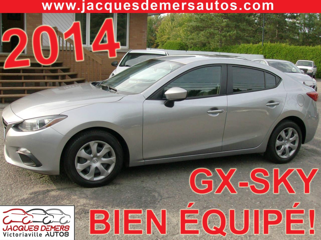 Mazda 3 GX-SKY 2014, seulement 54 000 km!! TRÈS PROPRE! Véhicule inspecté et garanti! Technologie Skyactiv très fiable et économique! Vitres teintées, feux antibrouillards, Bluetooth (téléphone mains libres), prise USB et auxiliaire audio, lecteur cd, volant télescopique, air climatisé, vitres électriques, serrures électriques et télédévérouillage, rétroviseurs électriques, contrôle audio sur le volant et beaucoup plus!! ******************************************************************************** FINANCEMENT directement sur place! TAUX D'INTÉRÊTS TRÈS AVANTAGEUX! ----- CHANGEMENT D'HUILE ET MISE À L'ORDRE EFFECTUÉS SUR TOUS NOS VÉHICULES! ** Aucun frais cachés! ** OUVERT DEPUIS PLUS DE 35 ANS! ** ASSISTANCE ROUTIÈRE INLUSE SUR TOUS NOS VÉHICULES! ** SERVICE TRANSPARENT!! PAS DE FAUSSES PROMESSES!! Ici, vous faites affaire directement avec les propriétaires avant la vente et après la vente! ******************************************************************************** Nous sommes situés au Centre-du-Québec à 1h de Québec, 1h de Sherbrooke, 30 minutes de Trois-Rivières et 1h30 de Montréal ----- NOS VÉHICULES SONT INSPECTÉS, MIS EN ORDRE ET GARANTIS! ----- Centre de l'automobile complet (Mécanique, carrosserie, pare-brise) en mesure d'offrir à tous ses clients un service personnalisé et de grande qualité! ******************************************************************************** SERVICE APRÈS-VENTE HORS PAIR! ----- Véhicules récents avec bas kilométrage aux meilleurs prix! ----- EXTENSION DE GARANTIE DISPONIBLE! ----- La place digne de confiance dans la région des Bois-Francs depuis 1978! ** ENTREPRISE FAMILIALE ** ----- 1581 NOTRE-DAME OUEST, VICTORIAVILLE ----- Appelez-nous pour prendre rendez-vous! ----- Consultez notre inventaire en ligne sur le www.jacquesdemersautos.com ********************************************************************************